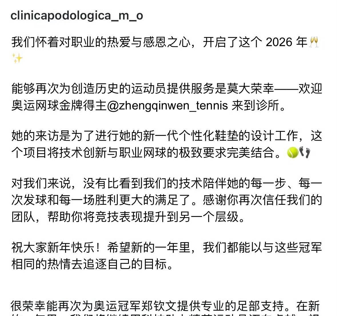 新鲜的郑钦文来了! 她去了巴塞罗那的一家足部诊所,不是因为伤病,而是去定制鞋垫,为澳网做准备。 诊所因为网球名将郑钦文的到来,还专门发文感谢文文的光临和信任。 仔细看文文的状态非常好,气血充足,容光焕发,经过一个冬训,似乎还胖了一点点。 1月12日澳网即将开幕,文文空降澳网,先进行表演赛,接下来是正赛。 希望文文穿着新鞋垫,步步为赢,迈向卓越! #郑钦文#