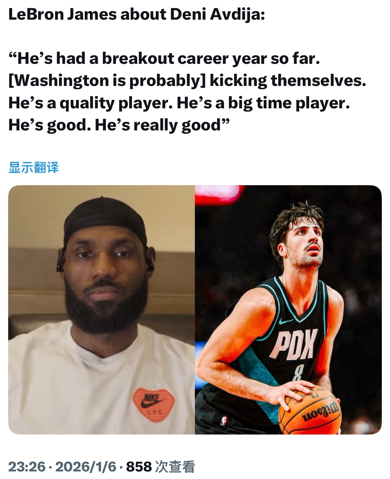 詹姆斯高度评价开拓者前锋阿夫迪亚:“到目前为止,他迎来了职业生涯爆发的一年。(奇才)大概后悔死了。他实力出众,是个大场面球员。他很出色,真的非常出色。”