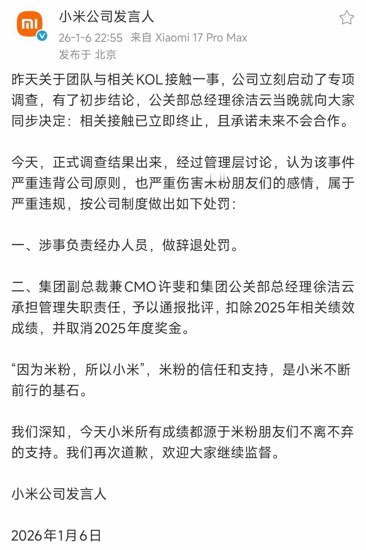 后续来了,处罚不可谓不重,看来是雷总的意志。如此迁就所谓的“粉丝”是健康的吗?几