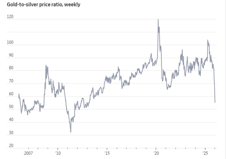 白银价格周二再创新高,首次收于每盎司80美元上方。黄金美股黄金 自2025年初以来,白银价格已飙升177%,今年以来涨幅就已达15%,交易员密切关注与黄金之间的比价,以此判断银价是否还有进一步上涨空间。尽管黄金近期也创下历史新高,周二收于4482.20美元/盎司,但购买一盎司黄金所需的白银数量正在快速降低。近期两种贵金属的交易价格,使黄金/白银比值降至约55,为13年来最低水平。比值越高,意味着投资者更偏好黄金,因其更具“避险属性”;而白银具有更多实际用途,例如医疗器械、汽车、餐具和太阳能电池板,因此价格更容易随经济波动。过去黄金/白银比值大幅上升的时期包括:2020年新冠封锁期间;2025年特朗普关税重压和对太阳能政策的威胁阶段。而在2011年白银投资热潮短暂高涨时,比值一度降至接近30。多头认为,这一历史水平表明白银仍有上涨空间;但怀疑者则指出,在2011年4月比值触底后,白银价格当年就暴跌了43%,需要警惕泡沫破裂的风险。(WSJ)为海外华人提供有价值的信息与分析,更多内容和全文可在蓝天、电报、x查找causmoney,或直接谷歌搜索caus.com
