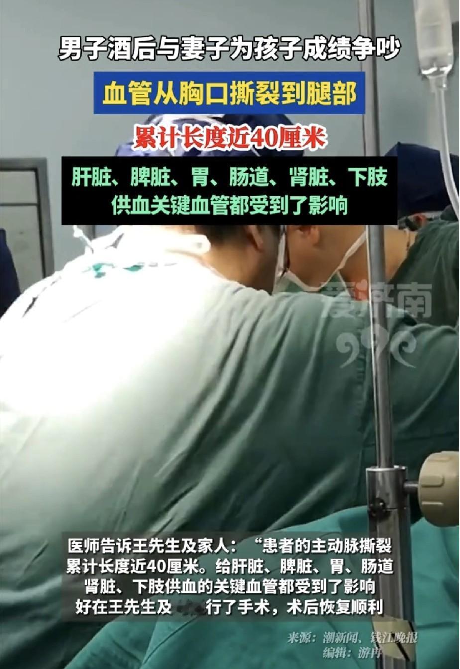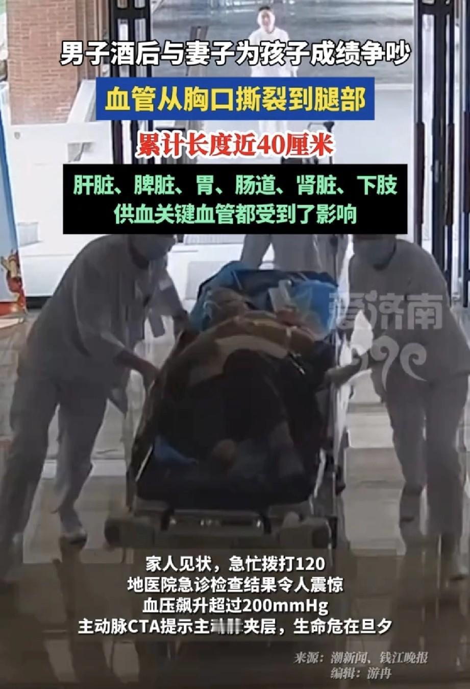 说出来你都不敢信,就跟老婆吵了一架,一位四十多岁的大哥居然把血管给“撕”开了,从胸口一直裂到腿,快40厘米长,肝脾肾这些重要器官的供血血管全受影响了,光听着都觉得后背发凉。影。 当天下午张先生结束工作后回到家,本就因为项目进度滞后而心情烦躁,进门就看到妻子在整理家务时,翻出了他放在口袋里未报销的票据,妻子随口抱怨了几句他做事马虎、不懂得整理,没想到这句话直接点燃了张先生的情绪。 积压了一天的压力瞬间爆发,他对着妻子大声反驳,两人的争执越来越激烈,从票据问题吵到日常琐事,情绪都变得极度激动。 争吵持续了将近半小时,张先生越说越激动,脸色涨得通红,呼吸也变得急促。就在他情绪最激动的时刻,胸口突然传来一阵剧烈的撕裂样疼痛,这种疼痛瞬间蔓延到后背,紧接着双腿也开始发麻。 他下意识地弯下腰捂住胸口,身体不受控制地摇晃了几下,随后便直直地倒在了地上。妻子见状吓得魂飞魄散,赶紧上前搀扶,却发现张先生的脸色已经变得惨白,冷汗顺着脸颊不停地往下流,连说话的力气都没有了。 妻子不敢有丝毫耽搁,立即拿出手机拨打了120急救电话,语无伦次地向接线员说明情况和家庭地址。急救人员在接到电话后,仅用12分钟就赶到了现场,初步检查后发现张先生的血压已经飙升到200mmHg以上,远超正常范围, 结合他描述的撕裂样疼痛症状,医护人员初步判断可能是急性主动脉夹层,这是一种死亡率极高的急症,48小时内死亡率高达50%。 为了争取最佳治疗时间,急救人员一边用药物为张先生控制血压和心率,缓解他的疼痛,一边小心翼翼地将他抬上救护车,火速送往附近的三甲医院救治。 途中,医护人员持续监测他的生命体征,不断调整用药剂量,同时联系医院急诊科做好接诊准备,确保患者抵达后能立即开展检查和治疗。 抵达医院后,张先生被直接推进了检查室,紧急进行主动脉CTA检查。检查结果让所有医护人员都感到震惊:张先生的主动脉从左锁骨下动脉位置开始,一路撕裂至左侧髂动脉,累计撕裂长度接近40厘米。 更危险的是,这场严重的血管撕裂已经影响到了多个重要器官的供血,肝脏、脾脏、肾脏以及肠道的供血血管都受到了不同程度的牵连,随时可能出现器官衰竭、血管破裂大出血等致命情况。 医院立即启动紧急救治预案,召集多个科室的专家进行会诊。专家团队经过快速评估后一致认为,张先生的情况非常凶险,必须立即进行手术治疗,否则随时可能丧命。 随后,医院迅速为他安排了手术,手术从当天晚上8点一直持续到第二天凌晨2点,历时6个小时,才成功完成了血管修复和置换。 术后,张先生被送进了重症监护室进行观察。主治医生介绍,手术虽然成功,但后续仍需要严密监测,防止出现感染、出血等并发症。 据医生透露,张先生本身就患有高血压,平时服药不规律,血压控制得并不好,而这次与妻子的激烈争吵,导致情绪急剧波动,血压瞬间飙升,正是诱发主动脉夹层的直接原因。 经过三天的精心护理,张先生的生命体征逐渐平稳,胸口的疼痛已经消失,之前麻木的双腿也慢慢恢复了知觉,目前已经转入普通病房继续治疗。 回想起这次惊险的经历,张先生满心懊悔,他没想到自己一时的情绪失控,竟然差点付出生命的代价,更让家人跟着担惊受怕。 主治医生借此案例提醒大家,隆冬时节本身就是心脑血管疾病的高发期,此时人体血管收缩,血压容易波动,一旦出现突发的剧烈胸背疼痛、胸闷等症状,务必第一时间拨打急救电话就医,切勿拖延。 对此,你们有什么看法,欢迎评论留言~