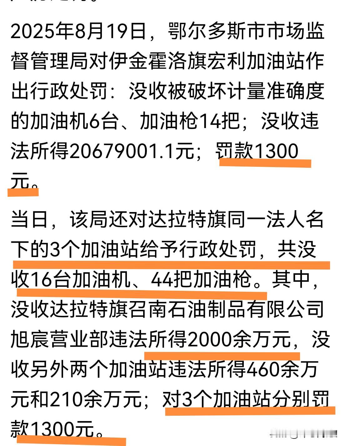 你知道吗?加油站多计量少给油被查,没收违法所得2000余万,处罚却只有1300元! 日常去加油站加油后,有的加油站加的油不耐用,总感觉烧的快!有这种感觉是对的,确实有这种现象,因为油给少了!尴尬的是,相关部门抓到了,又无法给予立案,因为一辆车加油的金额小,达不到立案标准。你看看,几个月,小的加油站违法所得就是几百万,大的加油站都是千万级,明明查出多计量少给油,却只能处罚区区1300元!还不够这些油老板一顿饭钱。相关部门是否应该修改相关法律法规,对这种多计量少给油的加油站从重从严处罚,才能起震慑作用。你说呢?欢迎评论。