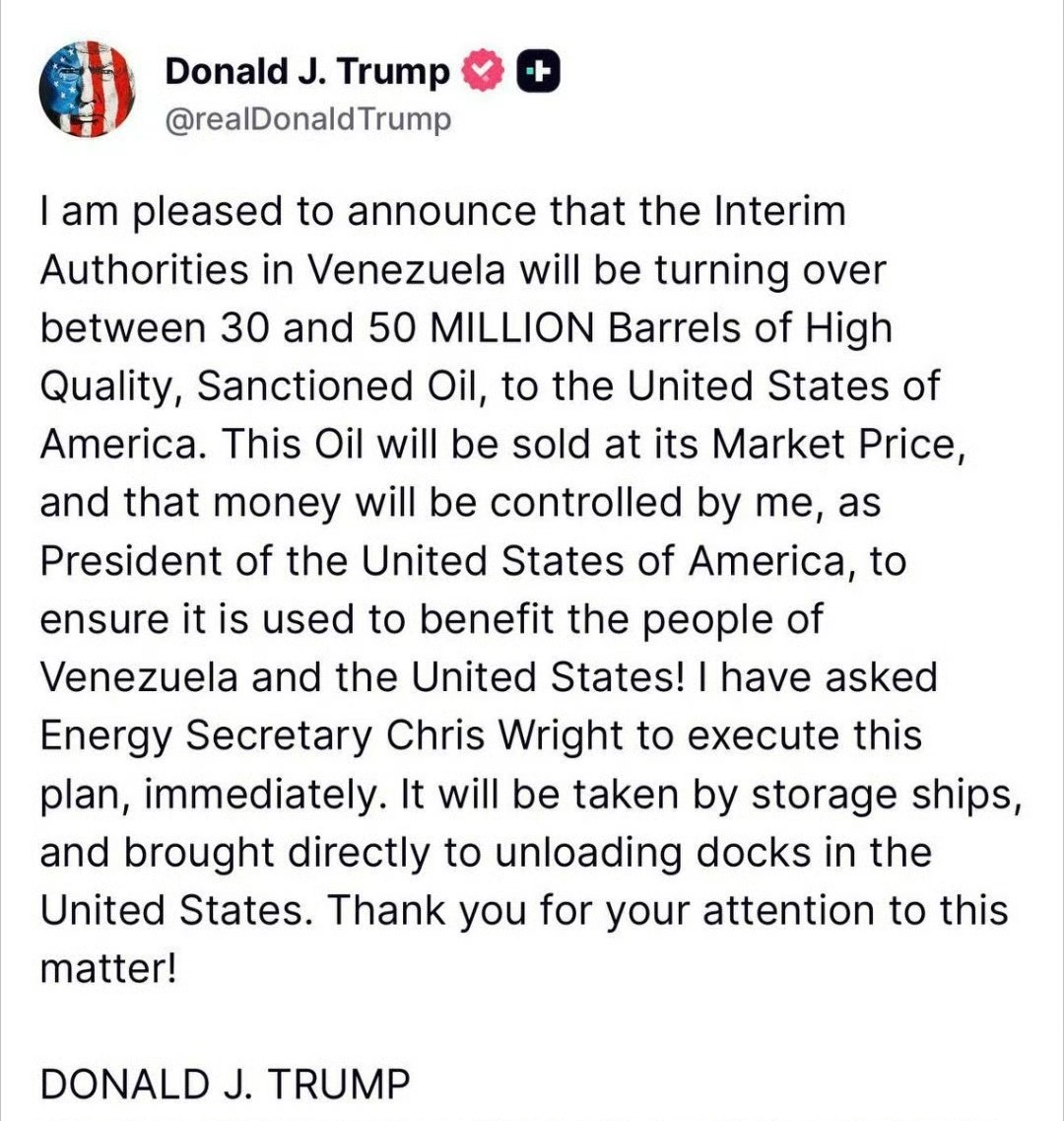 特朗普:委内瑞拉将向美国移交3000万至5000万桶石油 妈哎,演都不演了,白嫖石油啊最终目标暴露,美国还是觊觎委内瑞拉的石油,什么打击贩毒都是幌子。委内瑞拉或将移交3000至5000万桶石油