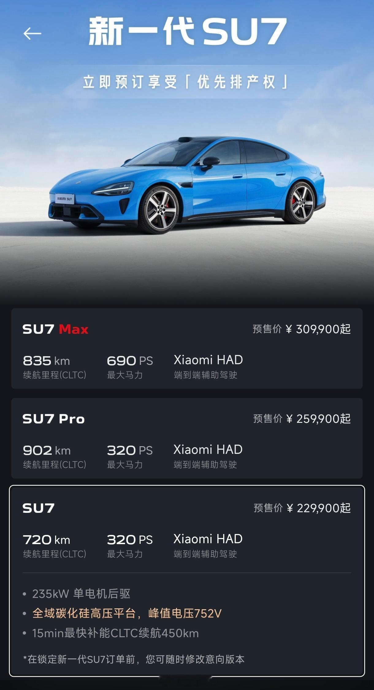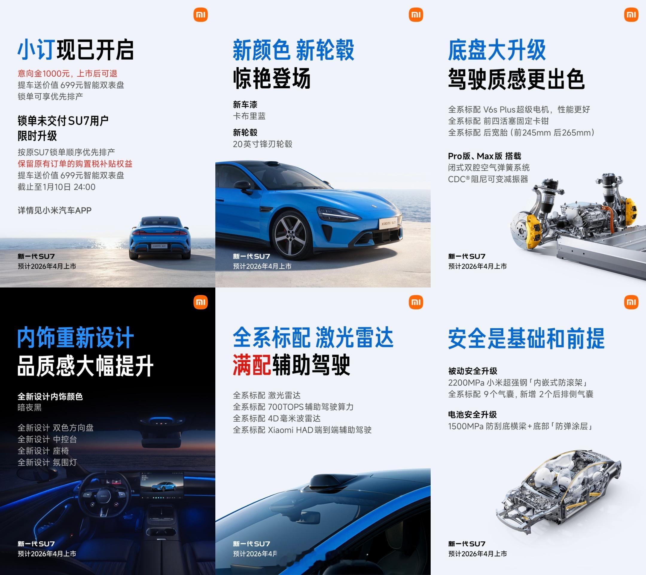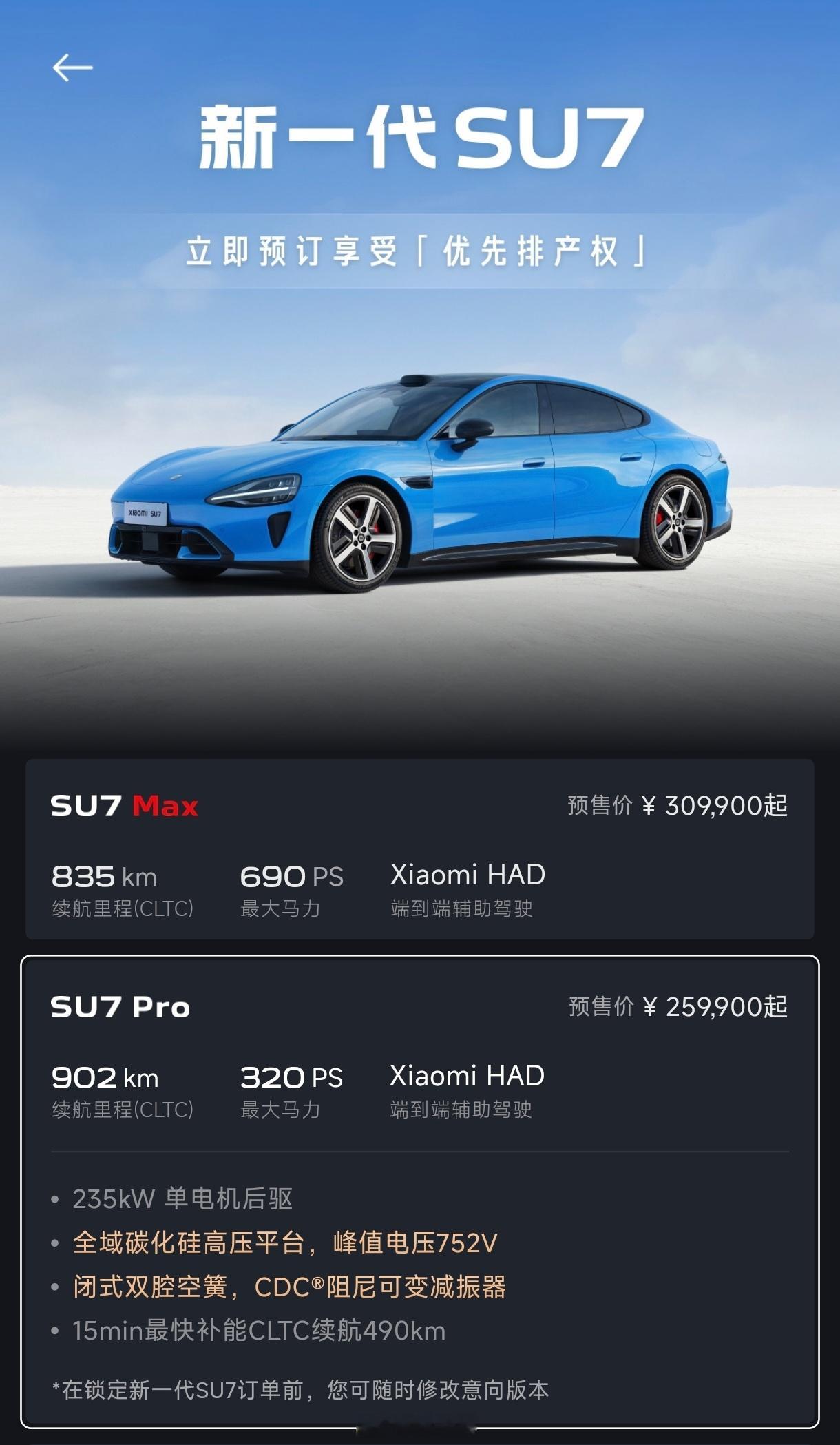新一代小米SU7亮相 预计今年四月上市。之前的小米SU7 无疑是非常成功的,无论是热度、口碑,还是销量,在 20 - 30 万区间基本没有对手。主要原因还是小米首台车用心去设计制造,几乎无短板。时隔两年,终于迎来了改款,这次带来了全新配色「卡布里蓝」,外观没有太大变化,但颜色、轮毂、内饰、底盘等,都焕新升级了,可谓是完美改款。动力更强,续航也更长。800V 架构 + V6s Plus 电机,全系标配激光雷达和长续航,Pro 最高 902 公里。关键 新一代SU7价格 才 22.99 万起,现在就可以下订,依照这个火爆程度,估计晚订又要等上小半年了。