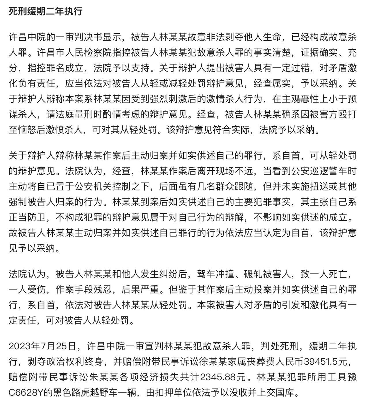 唉,又一个惨剧,判死缓,被告人和死者家属都不满意均上诉,你怎么看? ①被害人激化矛盾,有一定过错,应对被告人从轻处 法院:予以采纳 ②被告人林某某属激情杀人 法院:予以采纳 ③被告人林某某主动归案应认定为自首 法院:予以采纳