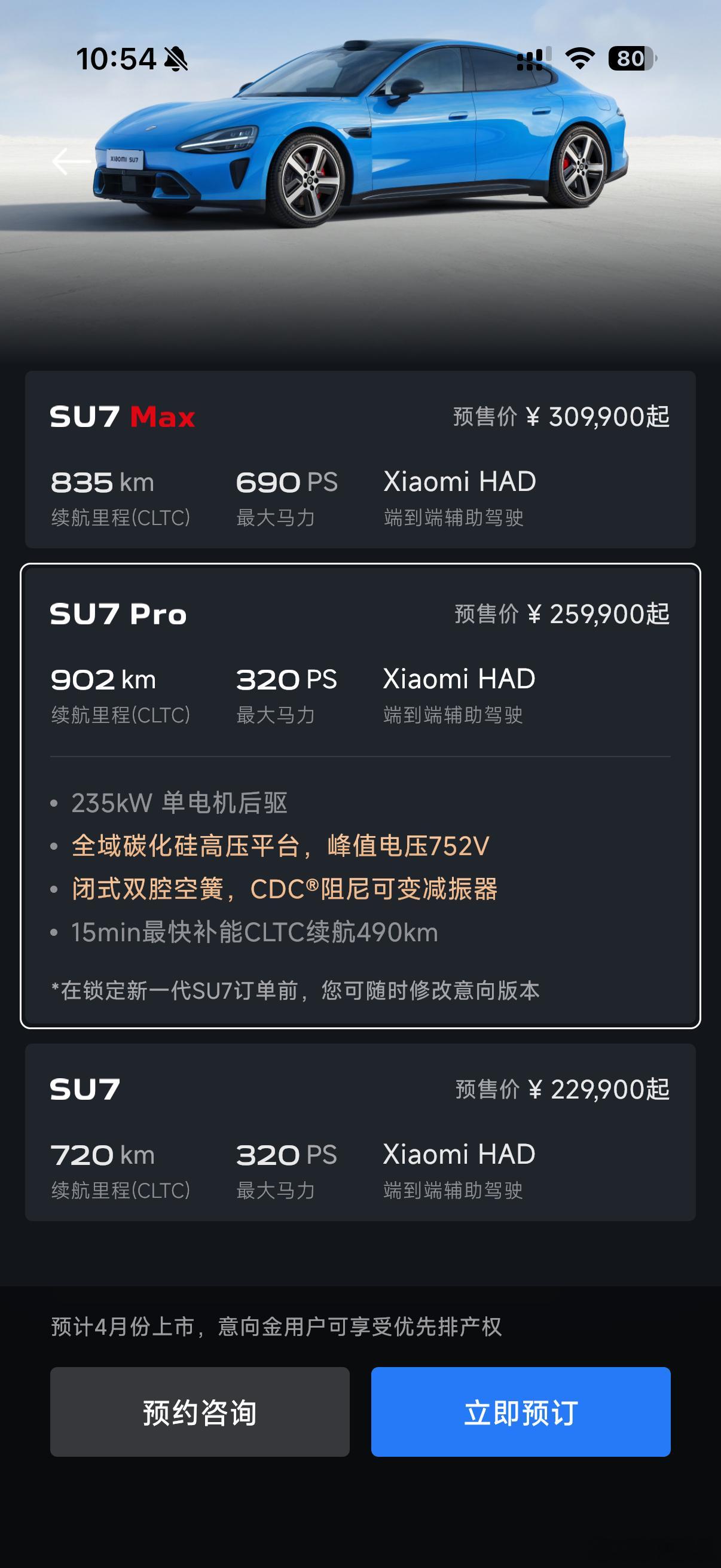 新一代SU7价格简单看了一下新版SU7的配置,升级幅度还是挺大的SU7标准版就标配激光雷达,800V架构SU7 Pro有了双腔空簧,CDC阻尼可变减震器,续航来到了惊人的902公里SU7 Max则是在Pro的基础上升级了高性能四驱,15分钟最快补能670公里价格小幅度上调,22.99万元起步