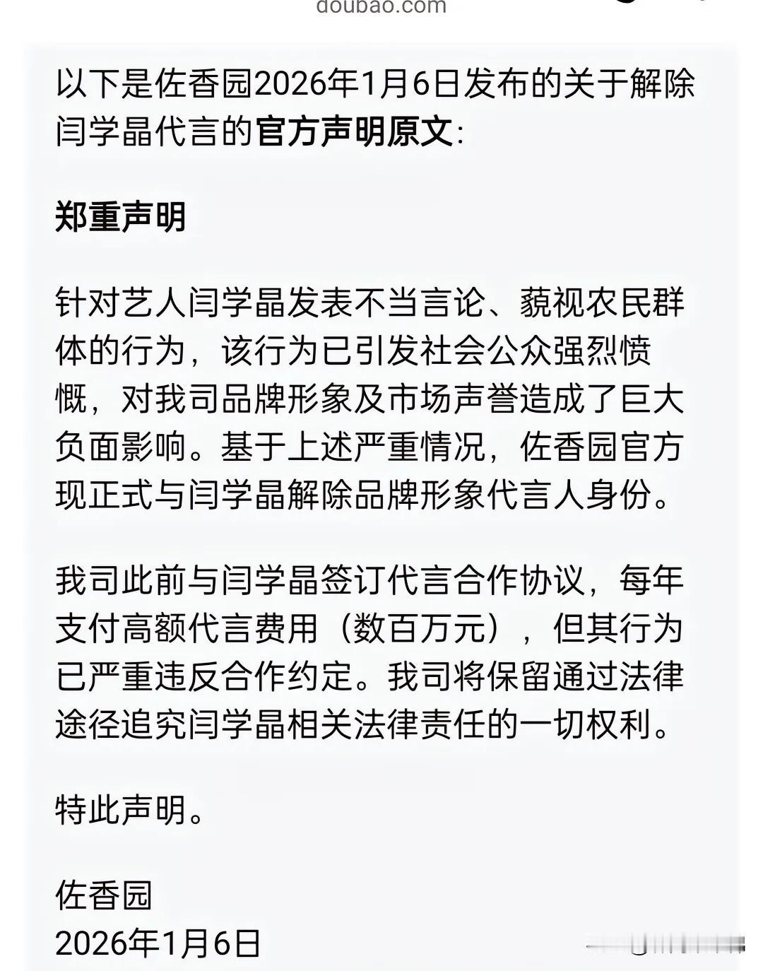 闫学晶回应的很好,下次别回应了!她姿态狂傲,称网友是“酸黄瓜”,不但没有挽回口碑,反而引得网友愈发抵制她代言的产品,品牌方不得已发布官方声明,已经跟闫学晶解除代言了! 声明里写着,其发表不当言论,藐视农民群体,这只是一部分原因。卖惨博同情,公众不买账,还被指责“无所事事”。 像闫学晶这样,积累了半生朴实无华的荧幕形象,如今一番言论就全部清零。网友又不傻,你演技再好,最打动人的也是你身上的真实,接地气,不做作。 可你现在竟和网友玩起了心眼子,明明比很多人过的好,还要来卖惨,想赚普通人的钱,又无法共情普通人的生活。被拆穿后不道歉,反而指责别人太较真。 奉劝闫学晶这类群体,想要在电商领域分一杯羹,还是要管好自己的嘴,拿出12分的诚意,才行!