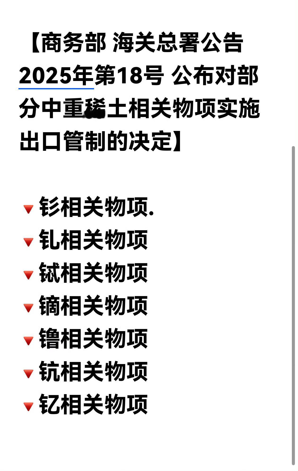 商务部决定加强两用物项对日本出口管制 【战争暴风就要来了】日本帝国主义、军国主义已经不是阴魂不死,而是现实加强版。日本鬼鬼祟祟、偷偷摸摸的“忍者”行为方式、思维方式和国民精神,保证未来还要大规模主动进攻、进行卑鄙的偷袭!附:中华人民共和国商务部、海关总署公告2025年第18号列管的7种中重稀土相关物项:钐相关物项钆相关物项铽相关物项镝相关物项镥相关物项钪相关物项钇相关物项中重稀土是高科技和战略性产业的核心材料,主要应用于永磁材料、国防军工、新能源、高端制造等领域,其独特性能在高温稳定性、磁性能和抗腐蚀性方面不可替代。涉及到的尖端制造领域包括:武器制导系统、隐身技术与结构材料、电动汽车与风力发电、节能照明与通信。禁止所有两用物项对日本军事用途出口决定加强两用物项对日本出口管制