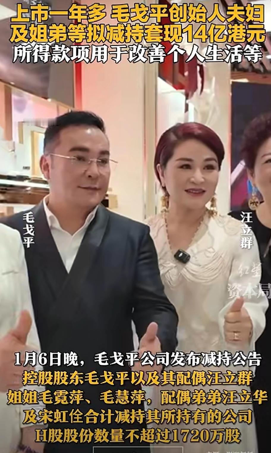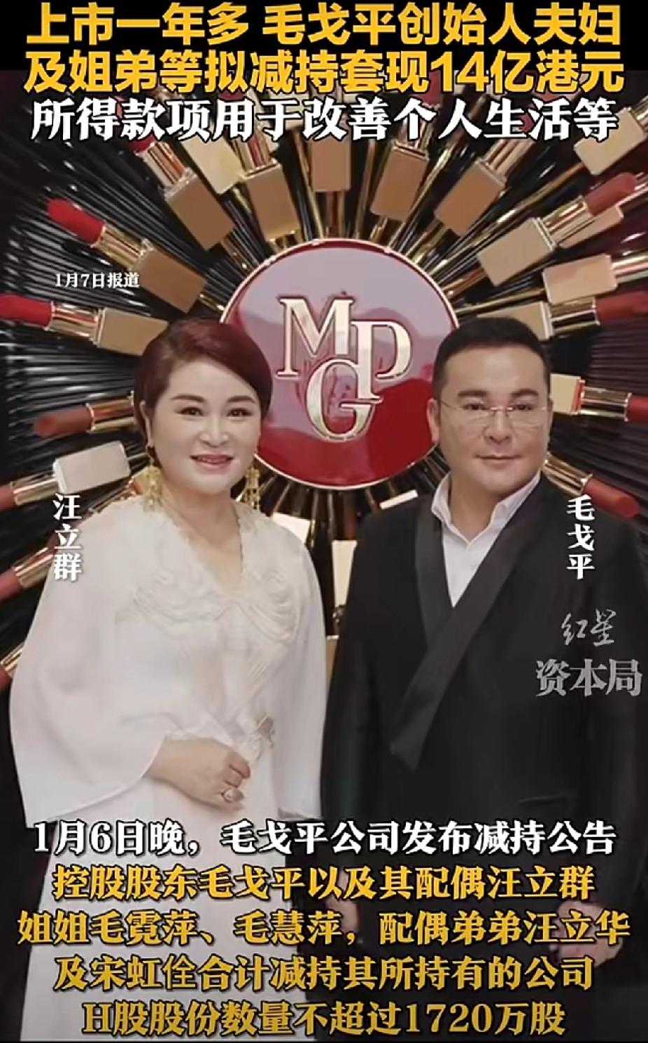 毛戈平创始人一家子, 干了一票大的。 毛戈平本人、老婆、两个姐姐、小舅子,加上总裁,集体宣布减持,套现目标直指14亿港元。 公告写得很漂亮:所得款项用于“美妆产业链投资”和“改善个人生活”。 说白了,就是钱已经赚够了,该把资产落袋为安,换个地方花了。 别被“投资产业链”这种官话忽悠了。如果真看好公司未来,为什么不追加投资,反而要急着卖股票? 如果你家楼下那个开了十年的金店老板,突然把铺面卖了,说要去“考察新项目”。你觉得他是看好新项目,还是觉得金店这行干不下去了? 连创始人都觉得股价是高点,你觉得你手里的筹码,是机会还是陷阱? 这次减持,毛家几乎全员出动。这说明在他们内部,已经达成了一种共识:现在的钱,攥在手里比飘在股市里踏实。 他们用大宗交易、分批卖出的方式,尽量不砸盘,这是“体面”的收割。既拿了钱,又不背骂名。 这手段,不可谓不老练。 这年头,看公司好不好,别光看财报上那几个漂亮的百分比。 看人,才是最关键的。 当一个公司的创始人家族开始排队套现, 他们忙着把股票变成现金,你还在忙着把现金变成股票? 捂紧钱袋子,别去接那些虚高的盘子。 在这个不确定的时代,只有落袋为安,才是最大的确定。