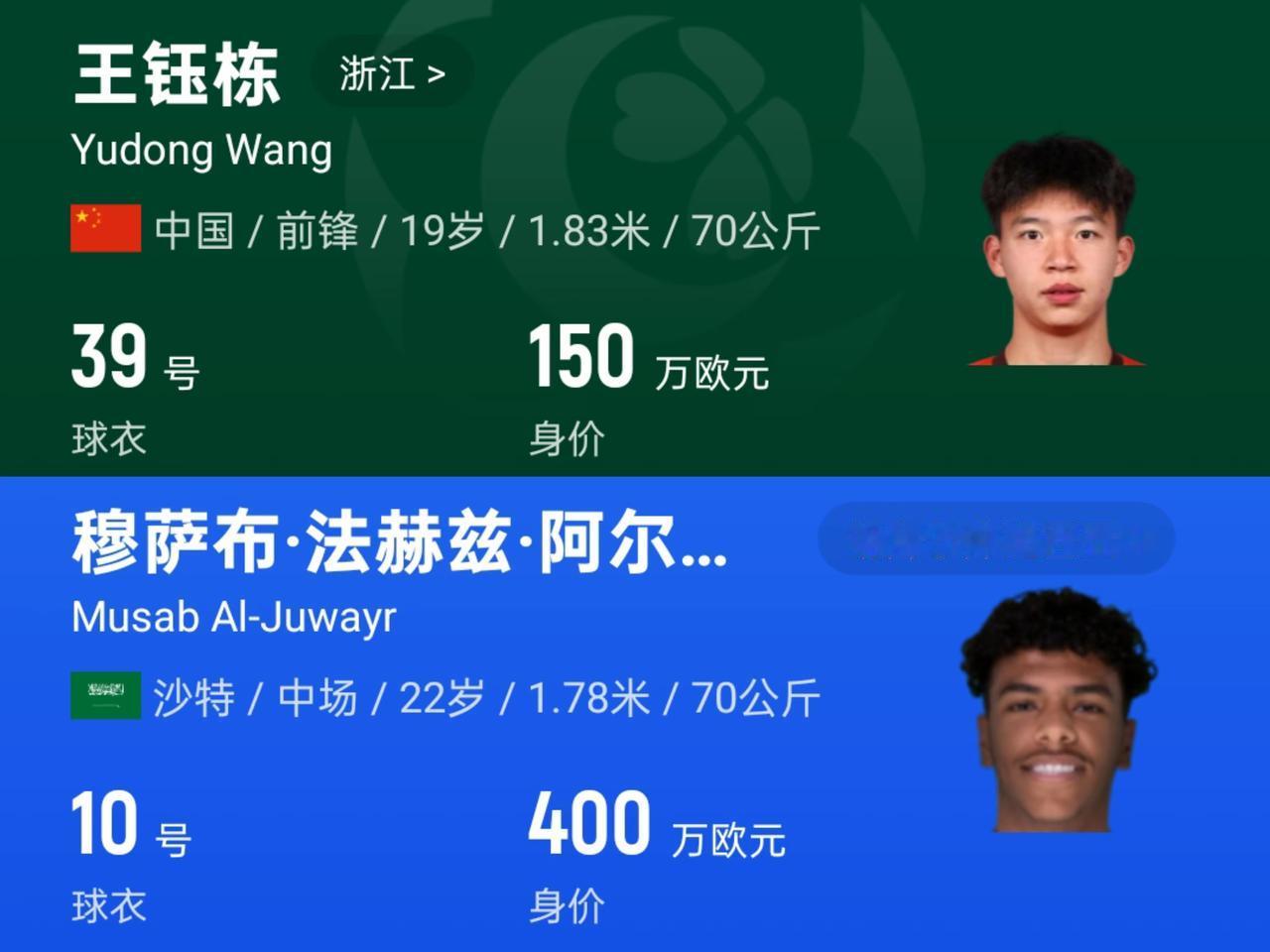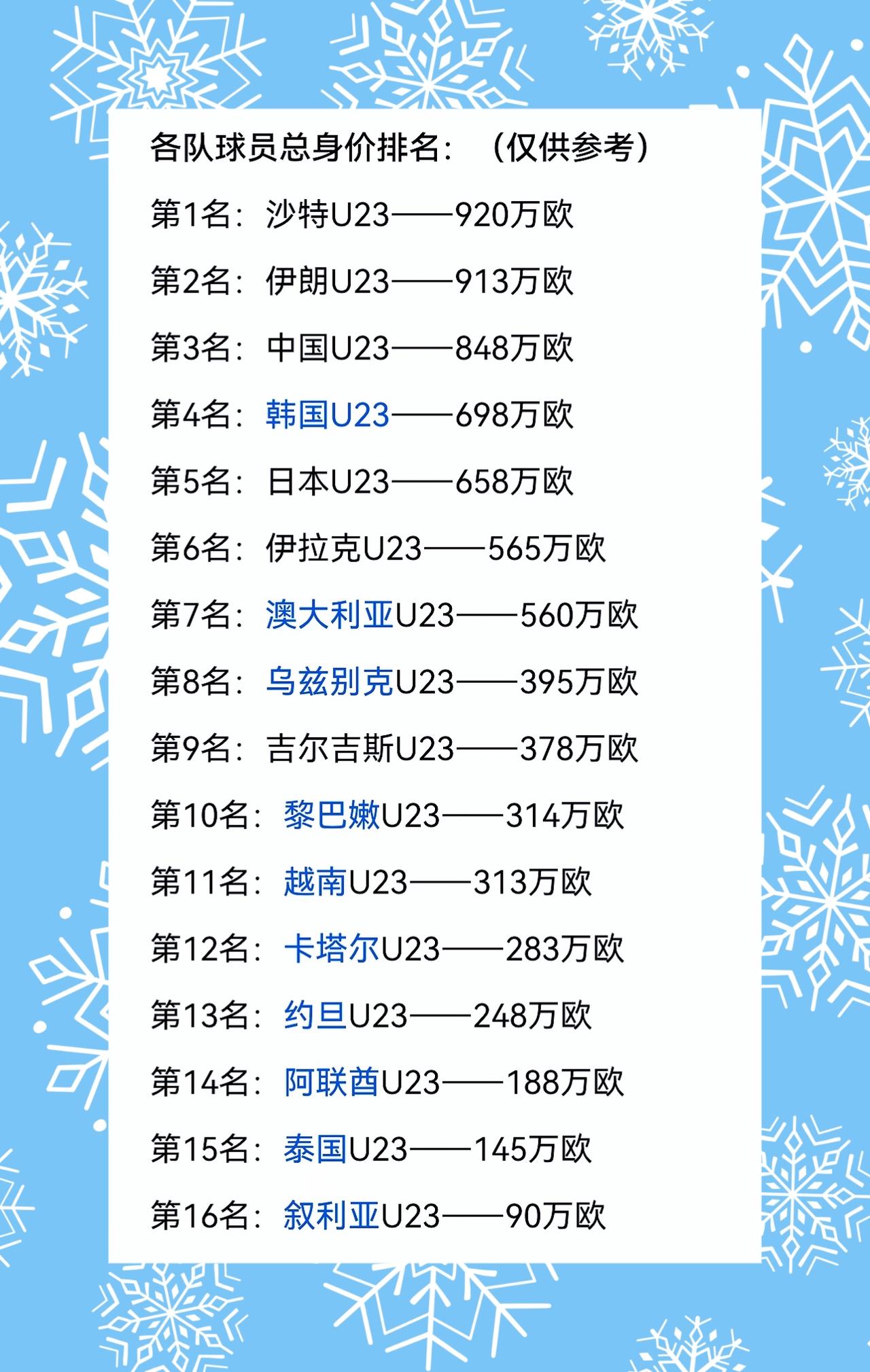 王钰栋身价高居亚洲杯参赛球员第二名,中国U23国足全队身价848万欧,竟然排在了亚洲杯16支球队第3名,仅次于沙特U23队和伊朗U23队,韩国队和日本队身价都没有中国队高,如果按照身价来看的话,这届中国U23国足真的强,按身价本届亚洲杯中国队进4强还是很有希望的。 本次亚洲杯球员身价最高的是沙特队的10号球员:穆萨布·阿尔朱瓦尔,中前卫,身价400万欧元,是沙特U23核心,现效力卡达西亚。王钰栋身价150万欧,中国队最高,U23亚洲杯第2名。 和中国同组的伊拉克和澳大利亚身价都比中国低多了,泰国队身价就更低了,仅145万欧,排名第15名,中国队这个身价不能小组出线就太丢人了,相信中国队大概率出线进8强,让我们拭目以待吧!