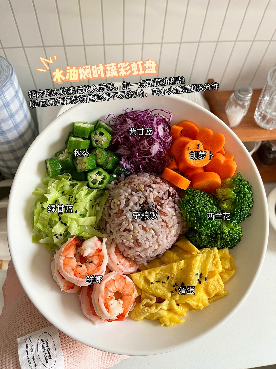 杂粮饭/紫甘蓝/秋葵/绿甘蓝/鲜虾🦐滑蛋🍳