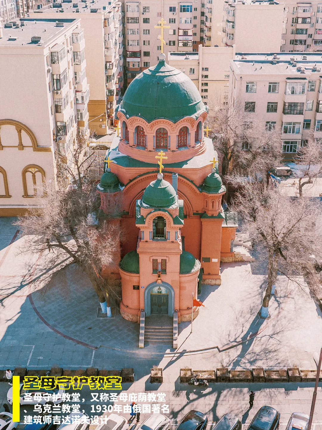 ✅圣母守护教堂,又称圣母庇荫教堂、乌克兰教堂,原为俄人旧墓地,最初在墓地建造石结构祈祷所一处,高约2米,内设圣母像和烛台。1922年动工建造了木结构教堂。1930年由俄国著名建筑师吉达诺夫设计,仿土耳其伊斯坦布尔的圣索菲亚大教堂的艺术风格