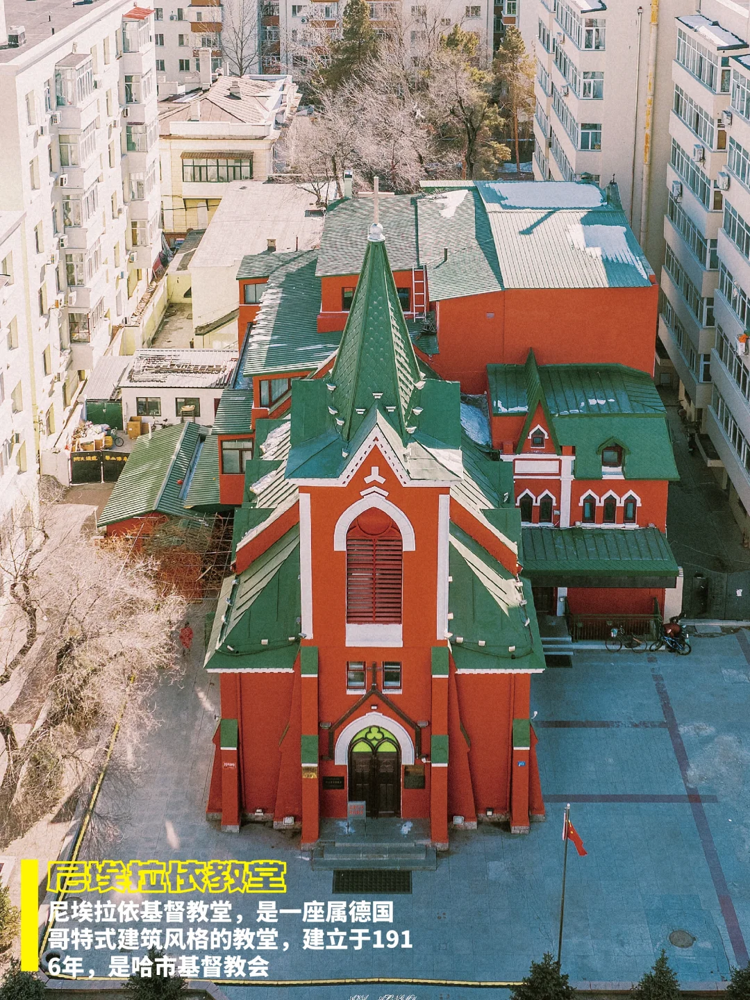 ✅尼埃拉依基督教堂,是一座属德国哥特式建筑风格的教堂,占地面积2360平方米,建筑面积453平方米,建立于1916年,是哈市基督教会
