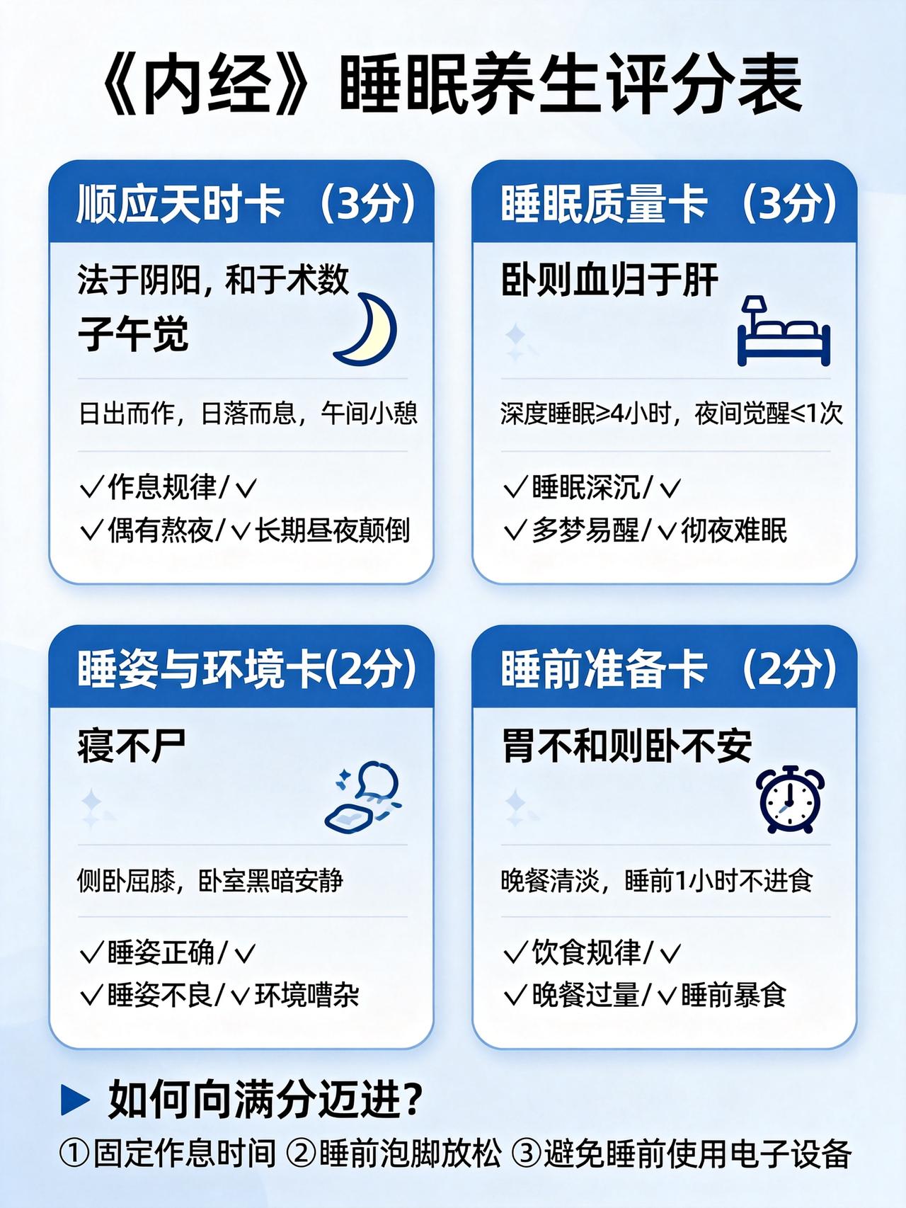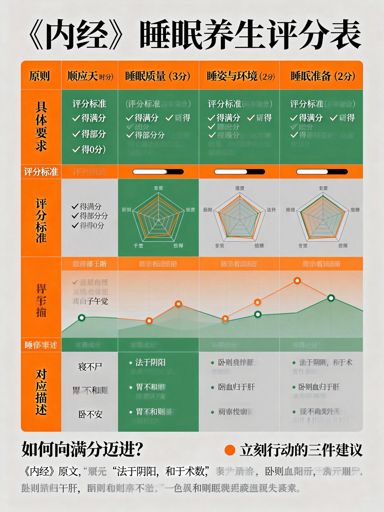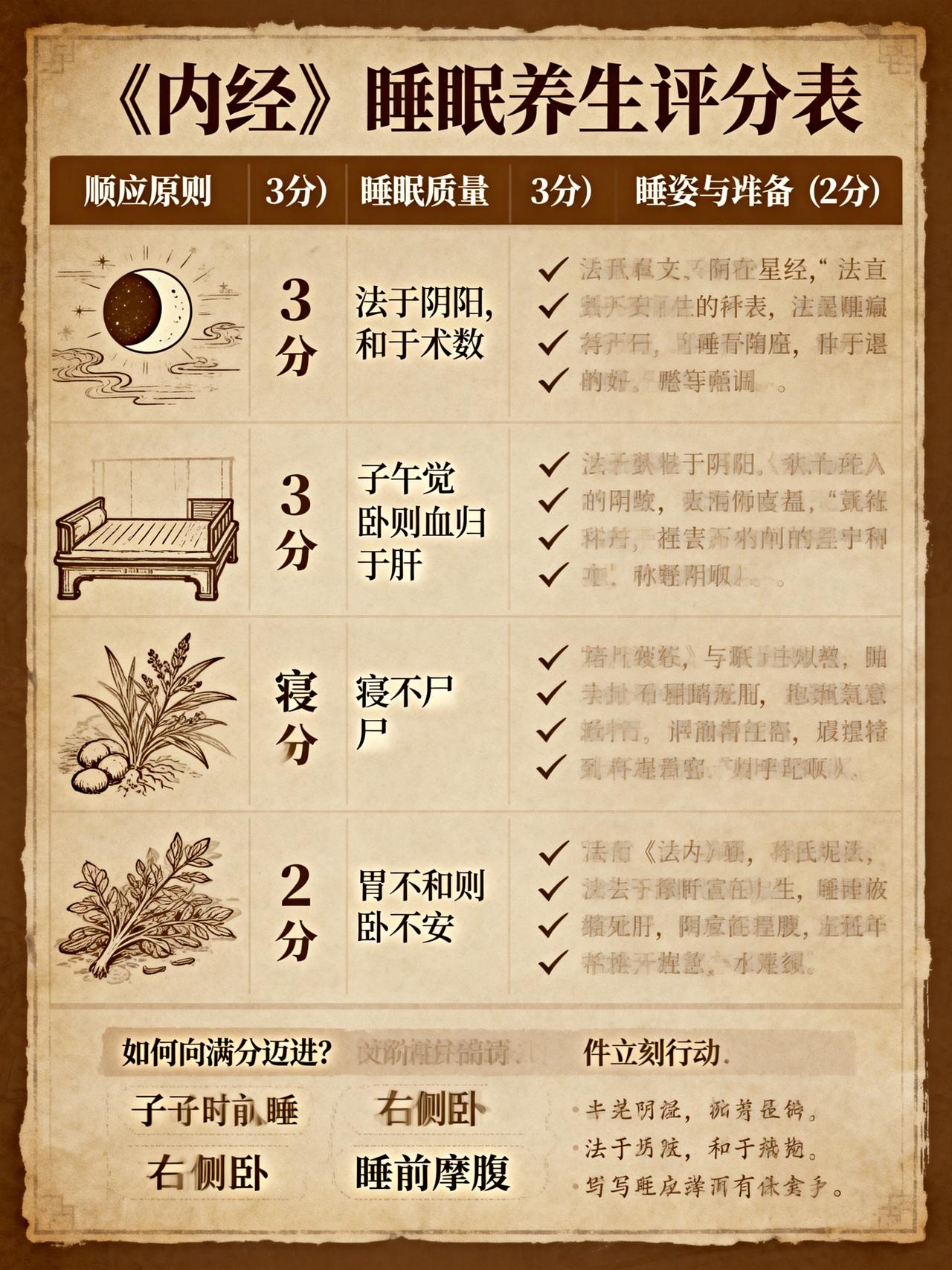 《内经》睡眠养生的核心原则(满分10分制) 1. 顺应天时:睡对时间(3分) 要求:“法于阴阳,和于术数”。核心是 “子午觉”。 子时(23:00-1:00):胆经当令,必须进入深度睡眠状态。此时不睡最伤阳气,导致次日精神不振。 午时(11:00-13:00):心经当令,小憩15-30分钟(“小憩”而非深睡),如“心肾相交”,能滋养心神。 您做对了吗? ✅ 21:00-23:00(亥时)准备入睡,23点前已睡着 → 得3分 ⚠️ 偶尔熬夜,但23:30前能睡 → 得1-2分 ❌ 经常熬夜至零点后 → 得0分 2. 睡眠质量:睡对状态(3分) 要求:“卧则血归于肝”。高质量的睡眠是身体修复、气血收藏的关键。 快速入睡:心神安宁,“神守于舍”。 少梦、少醒,晨起后神清气爽,如“蓄电池充满”。 您做对了吗? ✅ 躺下很快入睡,一觉到天亮,晨起精力充沛 → 得3分 ⚠️ 多梦易醒,或需较长时间入睡 → 得1-2分 ❌ 长期失眠、浅睡,晨起疲惫 → 得0分 3. 睡姿与环境:睡对方式(2分) 睡姿:“寝不尸”(不仰面僵卧),推荐如“弓”的侧卧,尤其右侧卧(“吉祥卧”),不压迫心脏,利于脾胃运化。 环境:“避风如避箭”,睡眠时忌风口直吹,保证昏暗、安静、空气流通。 您做对了吗? ✅ 自然右侧卧,注意保暖避风,环境舒适 → 得2分 ⚠️ 睡姿随意,环境有少许干扰 → 得1分 ❌ 习惯仰卧或蒙头睡,常在空调/风扇下直吹 → 得0分 4. 睡前准备:心与胃的安宁(2分) “胃不和则卧不安”:晚餐宜清淡、七分饱,睡前2-3小时不进食。 “神不守则寐不成”:睡前让心神安静下来,避免思虑、激动、玩手机(“目不醉于色”)。 您做对了吗? ✅ 晚餐早而清淡,睡前阅读/静坐,远离电子设备 → 得2分 ⚠️ 偶尔吃夜宵或睡前刷手机 → 得1分 ❌ 常吃宵夜、用脑过度或情绪激动后入睡 → 得0分 您的“睡眠养生”得分评估 8-10分:养生高手。您深得《内经》精髓,睡眠是您最好的“补药”。 5-7分:尚可提升。生活偶有干扰,但基础良好,调整细节即可更上一层楼。 0-4分:急需调整。您的睡眠习惯已影响健康根基,是时候优先改变生活方式了。 如何向满分迈进?《内经》的进阶提示 四季睡眠微调: 春夏季:“夜卧早起”(可稍晚睡,但要早起)。 秋季:“早卧早起,与鸡俱兴”。 冬季:“早卧晚起,必待日光”(收藏阳气)。 失眠的根源在于“阴阳不交”:白天适当活动(助阳气生发),晚上才能安静入眠(助阴气收藏)。久坐少动之人,往往睡眠也差。 午睡的关键:是“小憩”,不宜超过30分钟,过长反而耗气,影响晚间睡眠。 简单来说,您可以立刻行动的三件事: 设定一个“手机就寝闹钟”:比睡觉时间早半小时,提醒自己放下手机。 固定起床时间:比固定睡觉时间更容易做到,且能调节生物钟。 创造“睡眠仪式”:用温水泡脚、听轻柔音乐、做5分钟深呼吸,告诉身体“要入睡了”。 记住:《内经》的睡眠养生,本质是让人体节律与天地自然节律同步。当您把睡觉当成一天中最重要的事来经营,就是在为身体进行最根本的“充电”和“系统修复”。