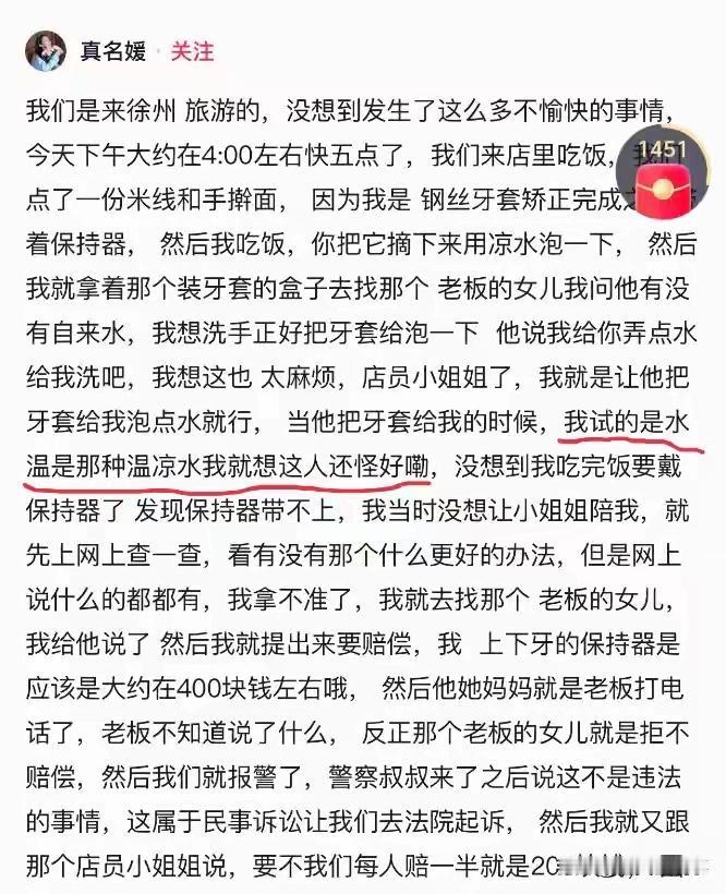 最近,一名女生到徐州旅游,到餐馆吃饭时请店员帮她泡牙套,可等女生用完餐戴牙套时,发现牙套戴不上了,随即便在店里闹了起来,并报警。在警方介入下,女生松了口,表示一人承担一半的责任,要求店员赔偿自己200块,可依旧被店员拒绝,这让女生认为自己作为游客受到了不公正待遇,当即将这事儿发到了网上。 有网友表示:有没有这样种可能:牙套来就是因自己误操作而变形,然后找个锅,不然谁会把这东西交给别人来处理。 不要把别人的责任无限扩大。什么叫如果店员多一句询问,如果有特殊要求就请主动说明,否则店家只要不是刻意或者过分的情形,都应该是免责。 店家没一点责任。1店员没义务做与餐饮毫无关系的事。2女生让店员洗牙套没交待清楚要用凉水什么的,人家以为这个要高温消毒呢,泡坏了也没责任。3这种私人性的东西一般人觉得恶心,不应让别人代劳。 这家店也该吸取教训啊,不是客人的什么要求都要答应,你是餐饮店,就提供好高品质的菜品!清洗牙套这事完全不应该接,顶多提供杯子。 对此大家怎么看呢