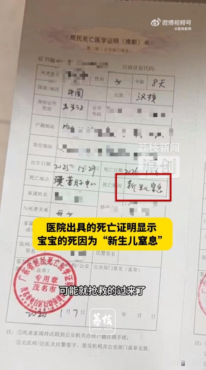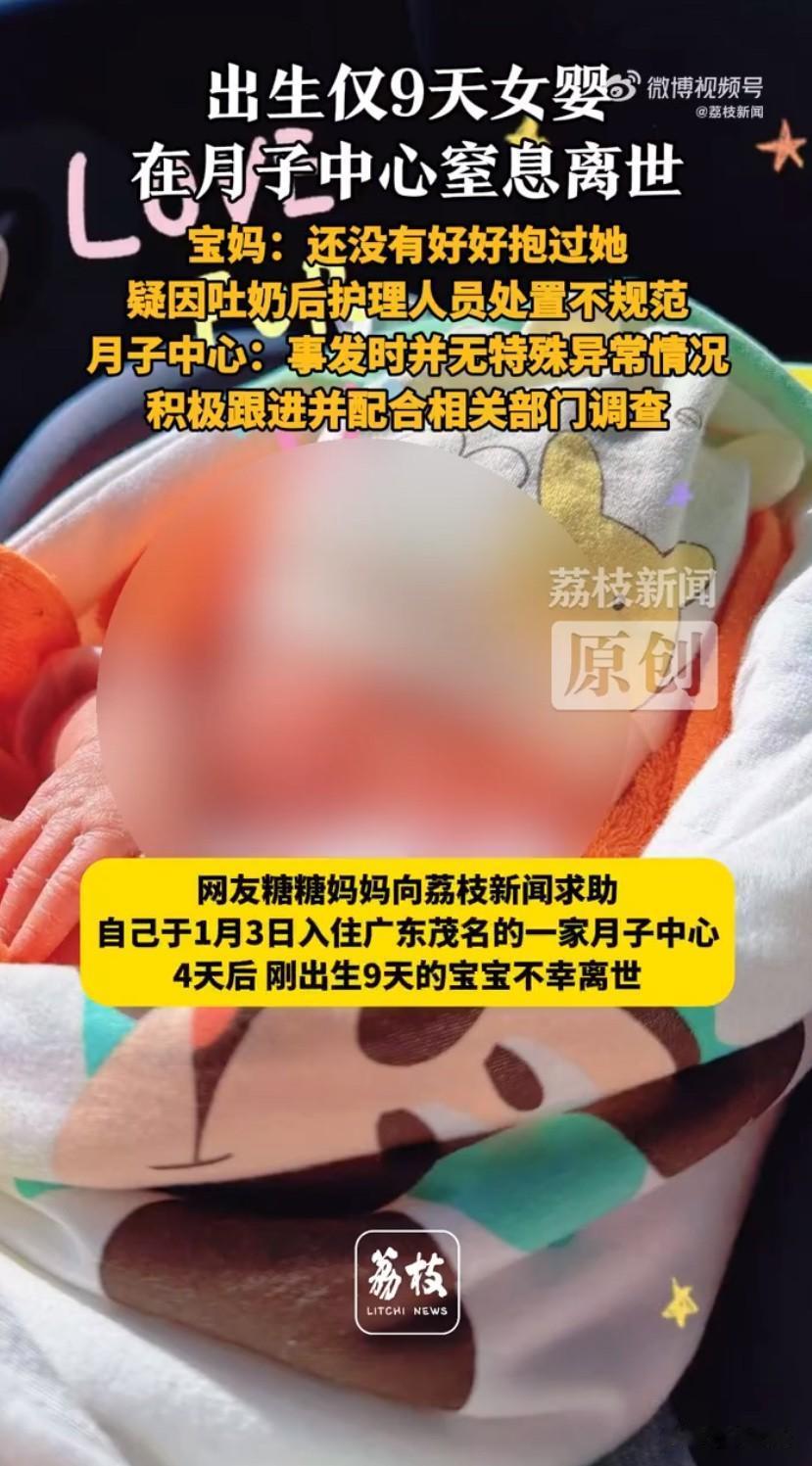 广东茂名一起月子中心的悲剧让无数家长揪心不已,刚出生才9天的女婴糖糖,在入住月子中心第四天就不幸离世,死亡证明上写着“新生儿窒息”,家属质疑是护理不当导致,这事儿传开后,网友们都替这家人感到难过。 宝宝名叫糖糖,妈妈本来想着月子中心有专业人员照顾,自己能安心休养,没想到却遭遇了这样的悲剧。据糖糖妈妈说,她入住月子中心后,一直把宝宝交给工作人员照护,那天早上七点多,工作人员突然通知她宝宝不舒服,让赶紧下楼带孩子去看医生。她急急忙忙穿好衣服跑下去,前后才五分钟时间,宝宝就已经没有了心跳,这个结果让她彻底崩溃,连好好抱抱孩子的机会都没有。 后来查看监控时,糖糖妈妈发现了关键疑点:事发当天早上宝宝吐奶后,工作人员没有让宝宝保持侧睡姿势,反而把宝宝的脸扭到了正面。要知道新生儿吐奶后侧睡是基本常识,能防止奶液呛到气管里引发窒息。更让她无法接受的是,之后宝宝吐奶更严重了,工作人员把宝宝抱出了监控范围,足足有二十分钟,回来后说只是在帮宝宝拍嗝,但这段时间里到底发生了什么,根本无从查证。等工作人员把宝宝抱来让她带去看医生时,宝宝的脸色已经发青,明显是窒息的危险信号。 面对质疑,涉事月子中心给出了不一样的说法,他们表示喂奶、换尿布或者抱哄时,宝宝确实会暂时离开一对一监控,这是正常情况。工作人员称发现宝宝溢奶后,已经用纸巾擦拭干净,还帮宝宝侧身、拍背,当时宝宝也哭了,没发现异常。后来组长觉得宝宝哭声里有痰,用吸鼻器处理后,才发现宝宝状况不对,赶紧通知了家长。 现在当地的公安、社区和卫健部门都已经介入调查,大家都在等最终的鉴定结果,想弄清楚这起悲剧到底是意外,还是真的和护理不当有关。网友们看完这事儿都特别气愤,有人说“花了钱找月子中心,就是信他们专业,连基本的防窒息护理都做不好吗”,也有人提醒“新生儿护理真的不能马虎,吐奶后侧身、密切观察这些细节,一个都不能少”。 这事儿也给所有家长和月子机构提了醒,新生儿护理容不得半点马虎,专业的护理知识和应急能力是底线,监控覆盖、操作规范这些细节更是不能含糊。希望相关部门能彻查此事,给家属一个公道,也让整个行业引以为戒,避免再让类似的悲剧发生。新生儿离世 宝宝离世 来源:荔枝新闻