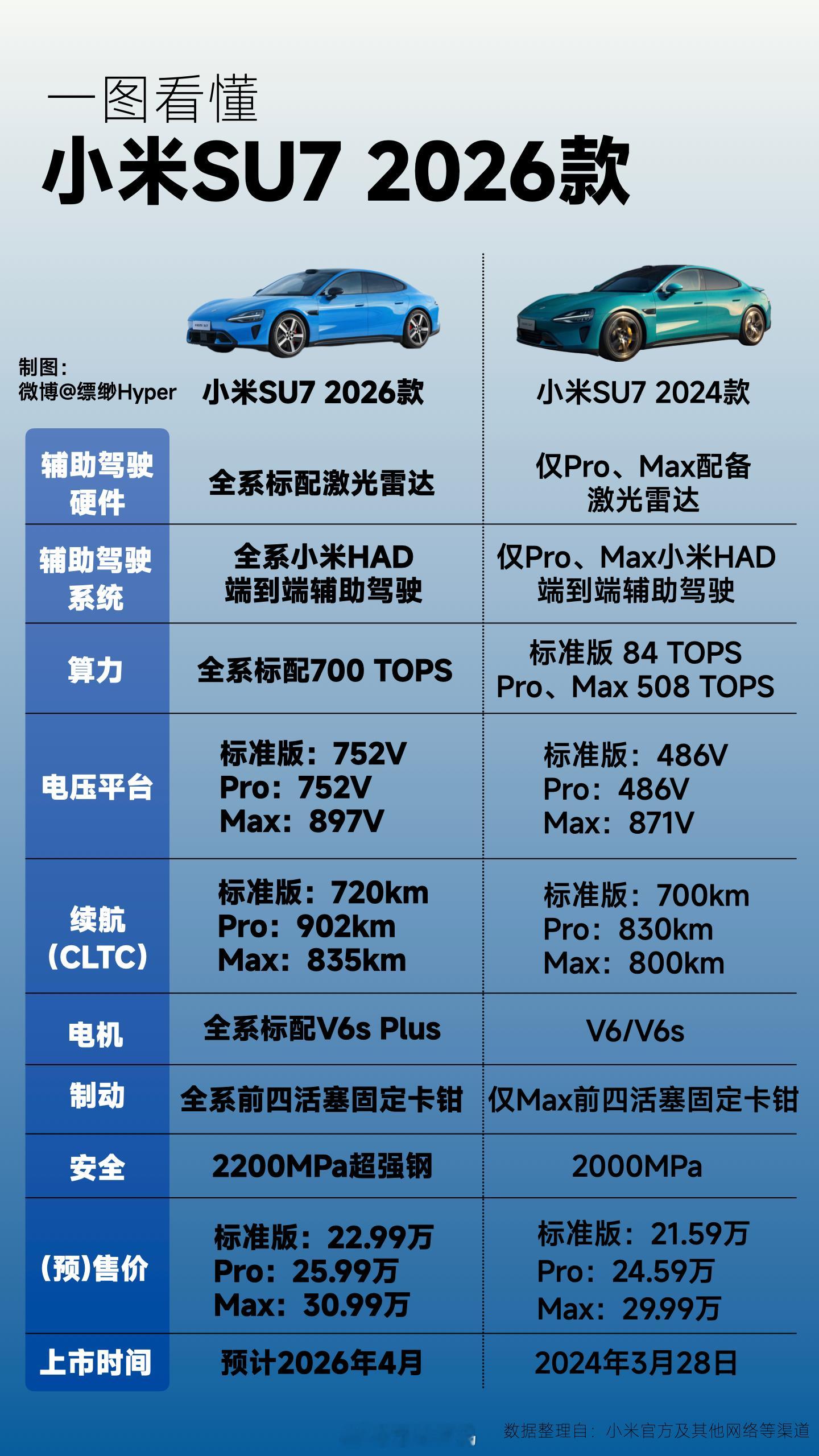 刚看完,新SU7的升级点还是比较吸睛的,把上一代的痛点考虑进去了动力提升至 800V架构+V6s Plus,续航加强+性能提升,前窄后宽轮胎(245/265mm)给配上了,操控属性加强。去年,我们在精英驾驶训练的时候,都在猜想SU7 2026款会加强智驾,现在给到全系HAD端到端辅助驾驶,且不分高低配,印证了想法。如果老车主,我是强烈建议转新款了 新一代小米SU7亮相