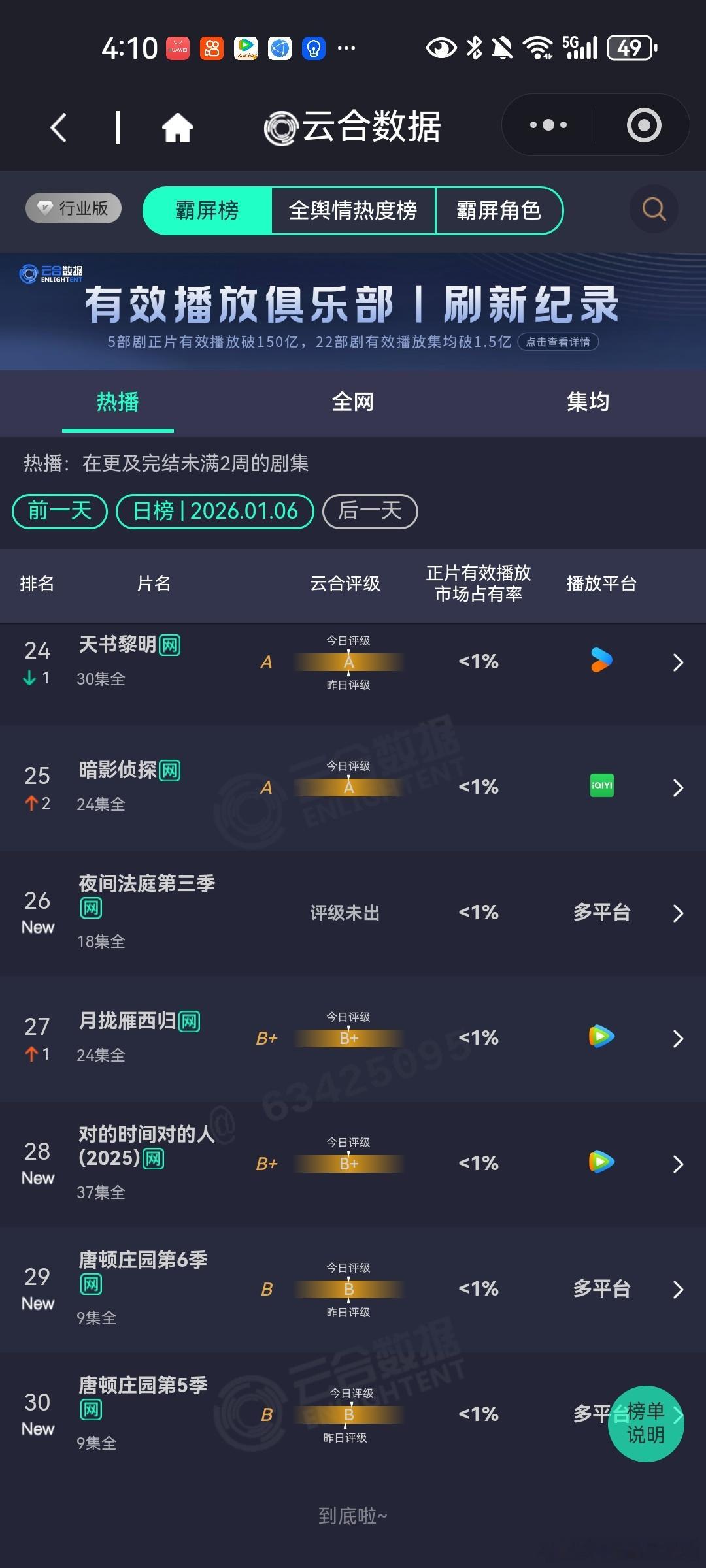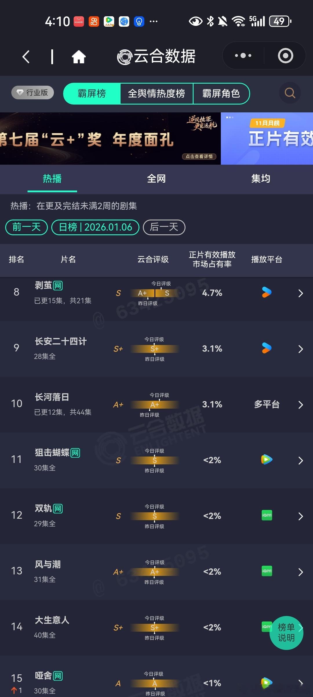 1月6日云合播放占比云合 罚罪2 18.8%这个榜首还蛮久啊。骄阳似我17.9%史灌逍遥15.5%一番是真不扛剧啊玉茗茶骨8.8%果然评级到S+了轻年6.2%人之初6.1%S+评级稳住了剥茧4.7%评级大幅提升,S级了。