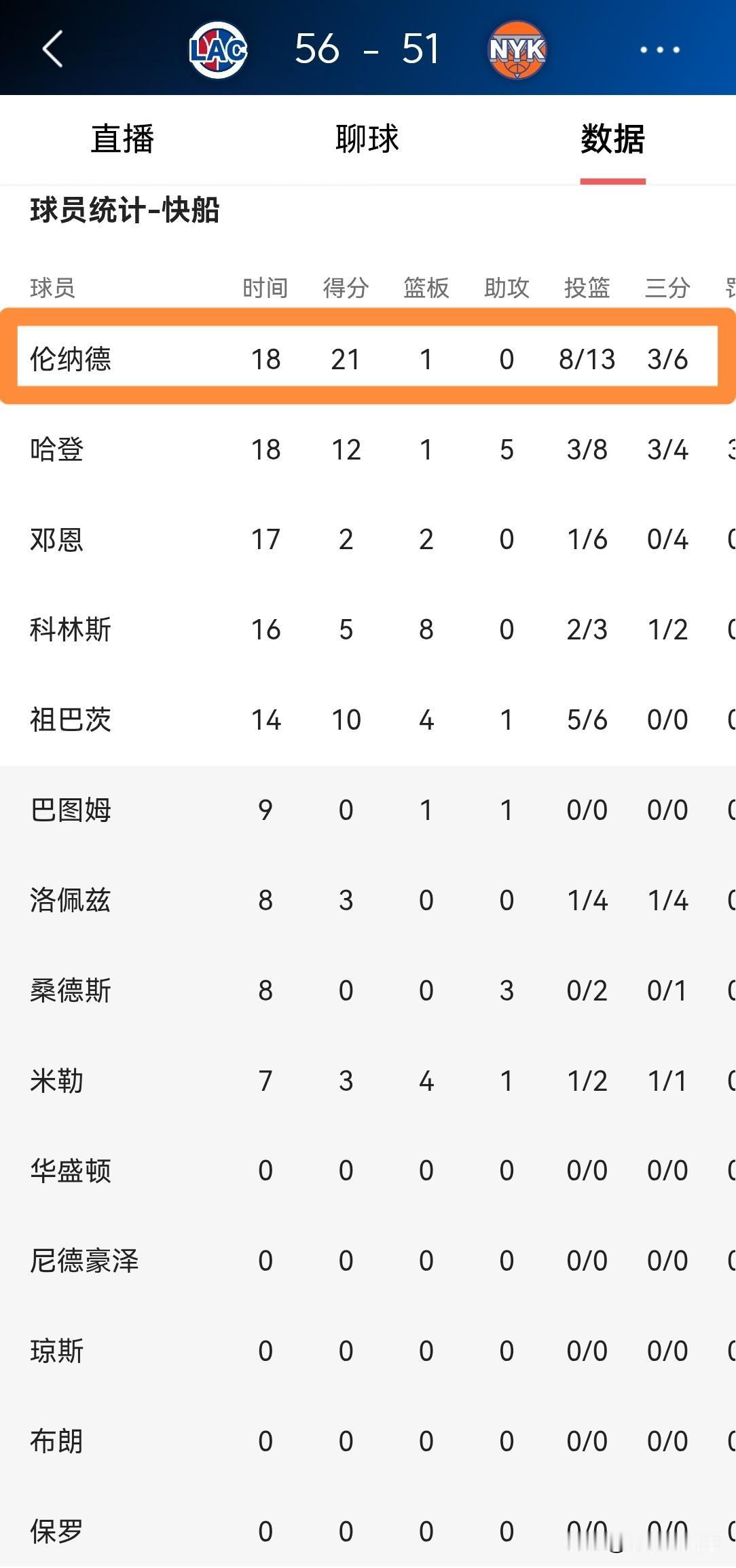 快船超级巨星伦纳德真是攻防一肩挑!在今天快船客场挑战尼克斯的比赛中,目前双方半场战罢,快船以56:51领先对手。值得一提的是,在前两节比赛中,伦纳德在攻防两端都打出了非常精彩的表现,他在首发出战的18分钟里,投篮13中8,其中三分球6中3、罚球3中2非常高效的得到21分2抢断,他的场上正负值为+2。 从伦纳德在上半场比赛中的表现来看,他在攻防两端都极具专注度,他非常渴望能够赢下本场比赛。