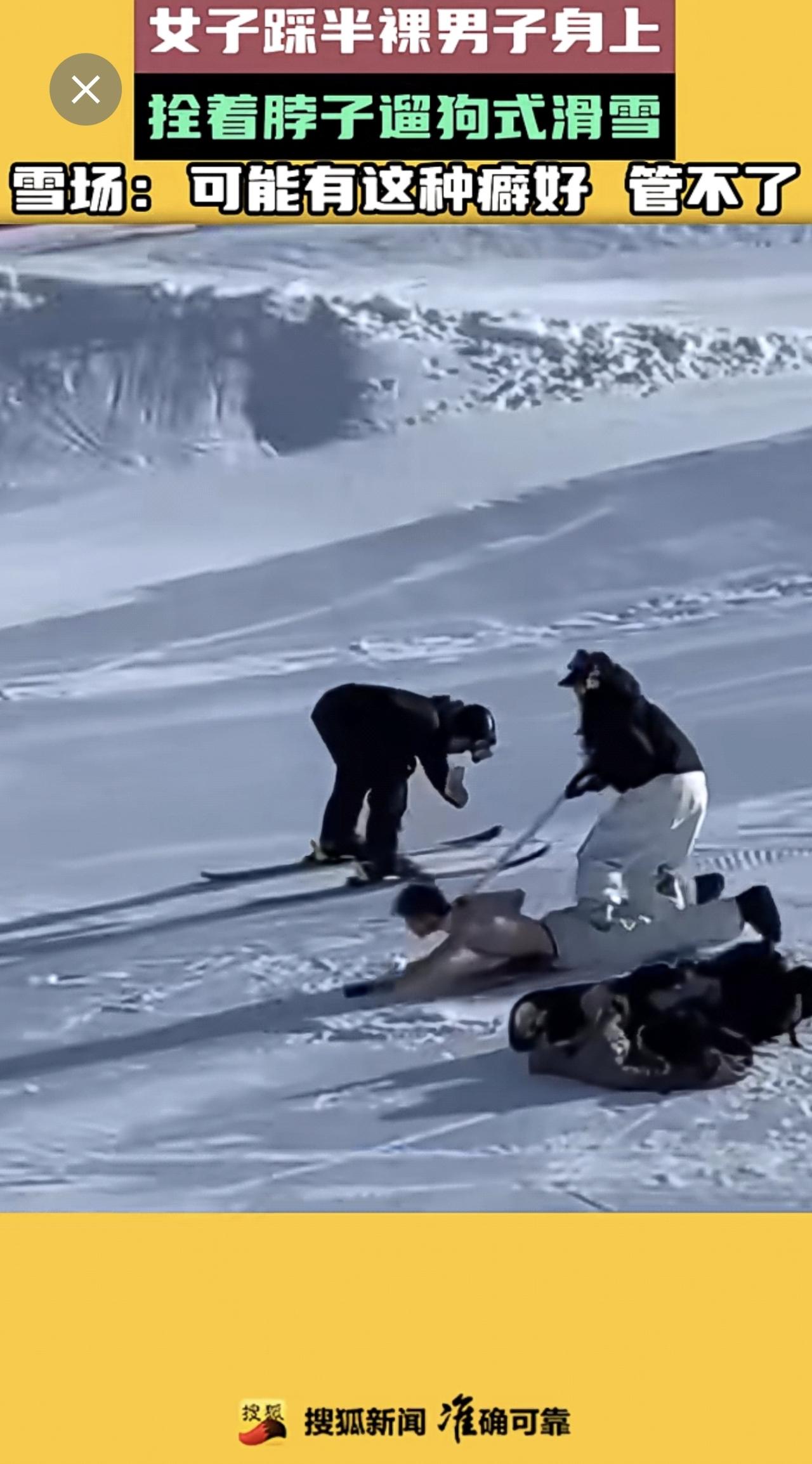 男子半裸被女子拴脖遛狗式滑雪,雪场回应:可能有这种小癖好,管不了。