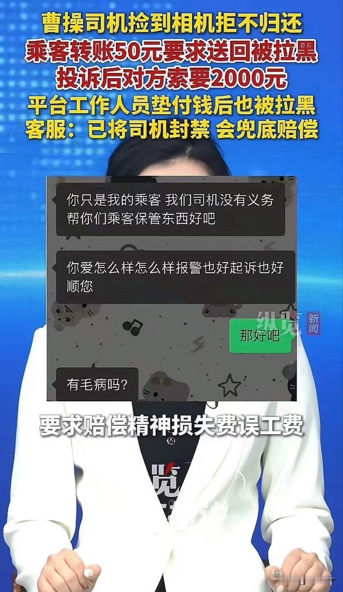 2026年1月1日,北京的付女士出门打了一辆曹操出行网约车,由于下车时比较匆忙把相机落在了车的后座上,相机价值3000元! 付女士发现后,赶紧联系了司机,自己出100块钱让司机给送过来,她立马就转了50块钱过去,说等相机送过来再给司机转50元! 付女士没等到司机来给送相机,却发现自己被司机拉黑了,于是她赶紧联系了平台把情况跟售后人员说了个清楚! 随后付女士就接到了司机的电话,司机说妇女是把他投诉了,导致自己账号受限、信誉分下降、接不了单!还说我没有义务给你保管相机,并跟付女士要2000块钱如果不给就要把相机扔掉! 平台工作人员知道情况后,赶紧把钱转给了司机,希望司机尽快把相机送给付女士!谁也没想到司机收完钱后,同样把平台工作人员也给拉黑了! 平台和付女士一同报了警,并承诺会全额赔偿付女士的损失!这样的司机真是没有职业道德,不是你捡的东西就归你了!只能说没文化真可怕!等待他的将是法律的制裁!