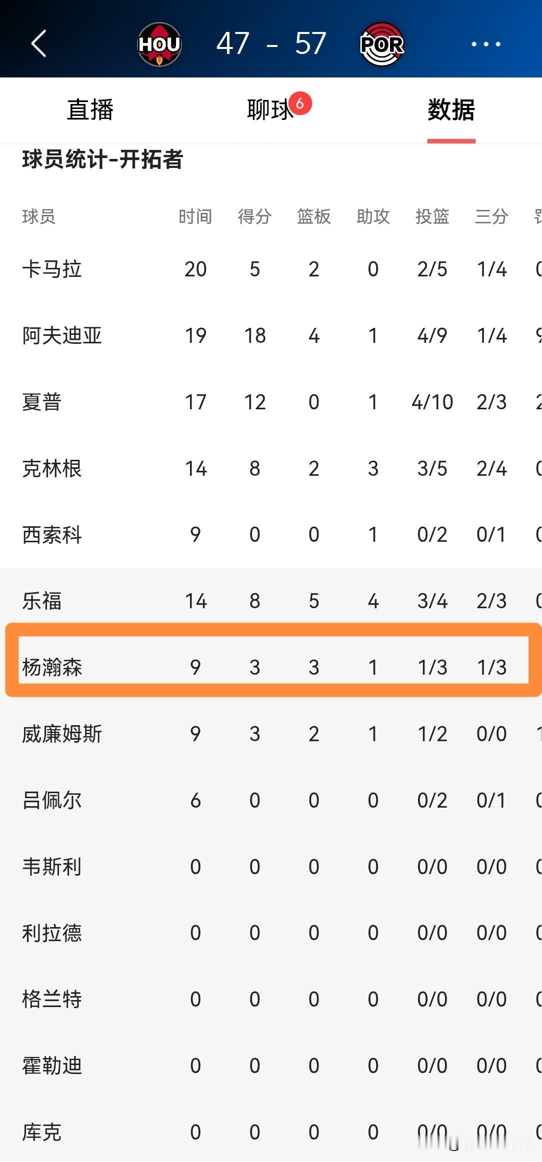 开拓者新秀杨瀚森打球越来越合理了!在今天开拓者主场迎战火箭的比赛中,目前双方半场战罢,开拓者以57:47领先对手。在前两节比赛中,杨瀚森替补出战9分钟,三分球3中1得到3分,还有3篮板1助攻,他的场上正负值为+3。 虽然杨瀚森在上半场比赛中的出手全都来自于三分线外,但是他在拼抢篮板和传球方面表现出色,杨瀚森越来越知道如何融入到球队的体系中了。