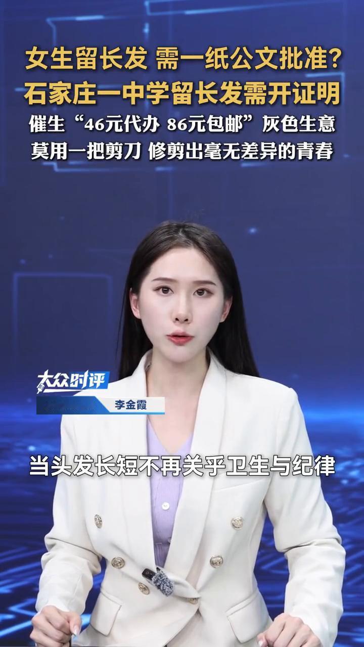 女生留长发需一纸公文批准?石家庄一中学留长发需开证明,催生"46元代办86元包邮"灰色生意。 留长发竟需一纸公文批准?近日石家庄第四十中学一名女生在社交平台晒出一份"留发证明"与保证书,将该校实行十几年的女生短发规定推上风口。为留长发她必须证明自己属于艺考类,需形象分学生,还要携家长、班主任签字,最后加盖学校公章才换得尘埃落定。 校方回应初中开始确有此要求,更令人唏嘘的是这样的规定催生了证明代办的灰色市场。有艺考机构借机提供证明办理服务,更有网络商家明码标价46元卖电子证明,86元包邮寄原件。当头发长短不再关乎卫生与纪律,却需要一纸公章来认证,甚至催生灰色产业,这本身就已偏离了教育的初衷。 统一发型被视为校园管理的有效方式,但过于严苛的发型要求实在舍本逐末。教育的重心本应在教学与成长,而非用同一把剪刀修剪出毫无差异的青春。