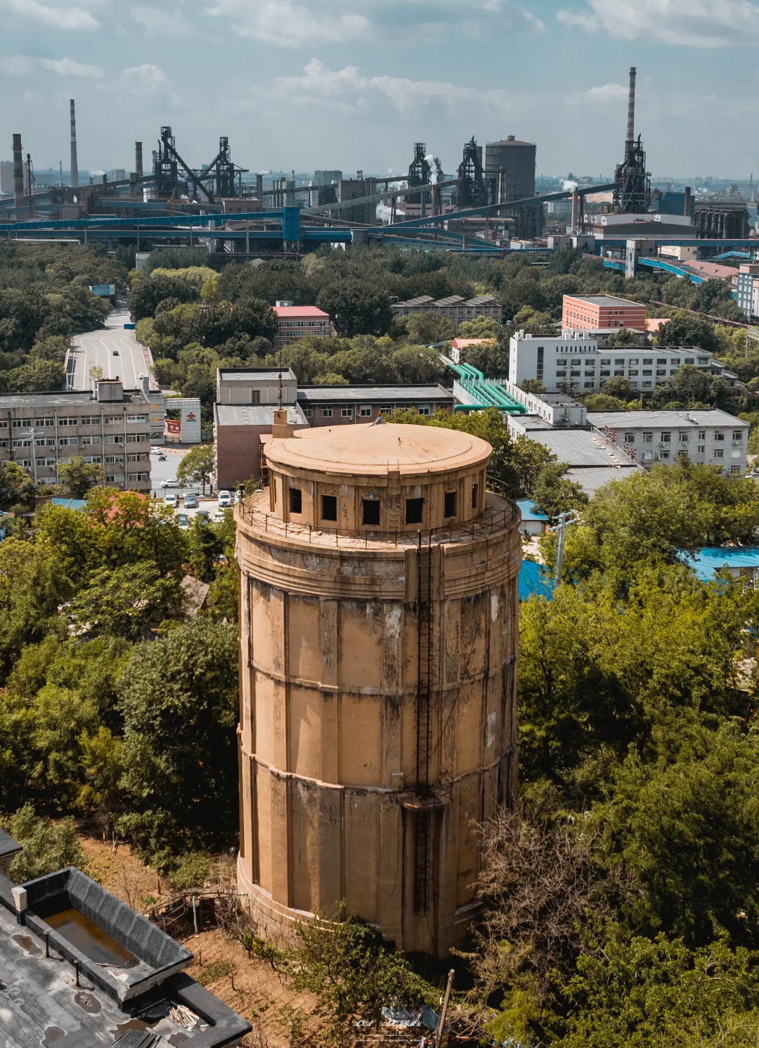 如果你看过《钢的琴》,一定对影片里的水塔印象深刻,如今对炉山水塔(图1-4)依然矗立在对炉山顶,1934年建成的砖红色塔身刻着时光的纹路,正对鞍钢高炉的选址藏着工业时代的默契,更是《钢的琴》里未曾褪色的时代背景——电影中主角父子凝望烟囱爆破的身影,就定格在这水塔的剪影之下