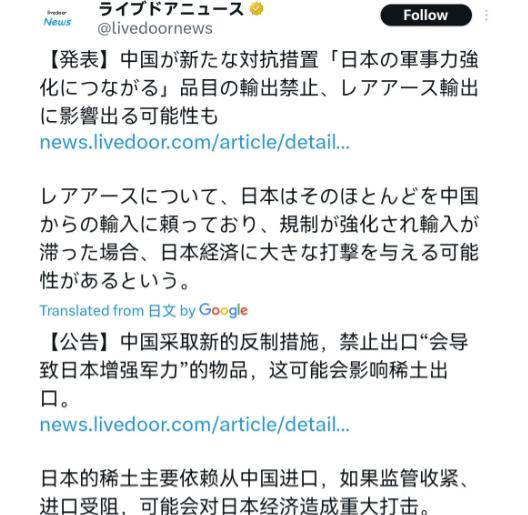 *没想到日本反应这么大!中方对日本实施军民两用物资管制后,有网友直言这管制比当年欧洲的瓦森纳协议还严,光禁运清单就列了一百多页,明眼人都看出来,这就是冲着日方不当言行来的——要么收回涉台错误言论,要么纠正错误做法,不然中日关系真没法往好里走。 要说这管制有多狠,跟瓦森纳协议一对比就清楚了。那个协议看着名头大,其实是自愿遵守的,成员国想放就放,也不针对特定国家。 但这次不一样,是专门对着日本来的定向管控,不光明确不准这些物资用于军事,连借着民用名义转去搞军事的路子都堵死了,这力度确实超出了常规操作,也难怪日本那边坐不住。 不少人可能不懂,啥是军民两用物资,说白了,小到造芯片的关键材料,大到高精度机床、航空航天零件,还有造电动车、导弹都离不开的稀土,全在管控范围内,官方清单里足足有800多项,覆盖十几个关键领域,这就是为啥清单能堆一百多页。 日本这么慌,核心就是离不开这些东西,就说稀土,这些年日本一直想找别的地方买,但日本 2024 年稀土进口71.9% 来自中国,其中造隐形战机、电动车电机必需的重稀土几乎 100% 依赖中国,尤其是造隐形战机、电动车电机必需的几种重稀土,几乎全得从中国进口。 有权威机构算过,要是这管制持续一年,日本经济得亏两万多亿日元,GDP直接往下掉0.4个多点,这还只是稀土一项的影响。 更直观的是,管制消息一出来,日本股市当天就跌了,跟矿业、制造业相关的股票跌得更厉害,资本圈都慌了,更别说企业了。 甚至回避“台湾是中国领土”的说法,还想着搞再军事化,修改安保相关文件、增加防卫费、放开武器出口限制,这些操作全碰了中方的底线。 官方早就说过,台湾问题是核心利益中的核心,日本没资格插嘴,之前也多次提醒过,但日方根本没当回事,这才迎来了实打实的管控。 再看看日本这边的反应,一边是官方出来抗议,说“不可接受”,但这话根本站不住脚,之前都反复提醒过了,不听劝才出的管控,哪来的“不可接受”? 另一边,在华的日本企业已经急了,赶紧出来表态,想让两国说清楚规则,怕影响自己做生意。 这也能看出来,政客嘴硬没用,企业心里门儿清,跟中国的合作有多重要。 可能有人会问,这么管控是不是太严了,其实一点都不,这么做完全合情合理。 国际上早就有规矩,日本作为二战战败国,本就不能随便发展能用来武装自己的产业,这次管控说白了就是防止军国主义抬头,维护地区安稳。 之前别人用类似手段针对别人的时候,日本没说话,现在轮到自己就喊冤,这双标也太明显了。 而且这管控也不是没回旋的余地,核心意思很明确,只要日方纠正错误,收回不当言论,遵守之前的约定,事情还有转机。 中日关系好这么多年,靠的就是互相尊重核心利益,之前的老规矩一直是两国关系的压舱石,现在有人非要破坏,那自然要付出代价。 说到底,这事就是日方政客犯错,让老百姓和企业买单,正常的民用贸易该咋做还咋做,中方没堵死合作的路,只是划了条红线,不能用咱们的东西搞事、损害咱们的主权。 中日关系的大门一直开着,但钥匙在日方手里,能不能抓住机会改错,别让关系越搞越僵,就看他们有没有这个觉悟了。 毕竟国与国相处,尊重别人的底线,才能好好打交道,这道理其实挺简单的。