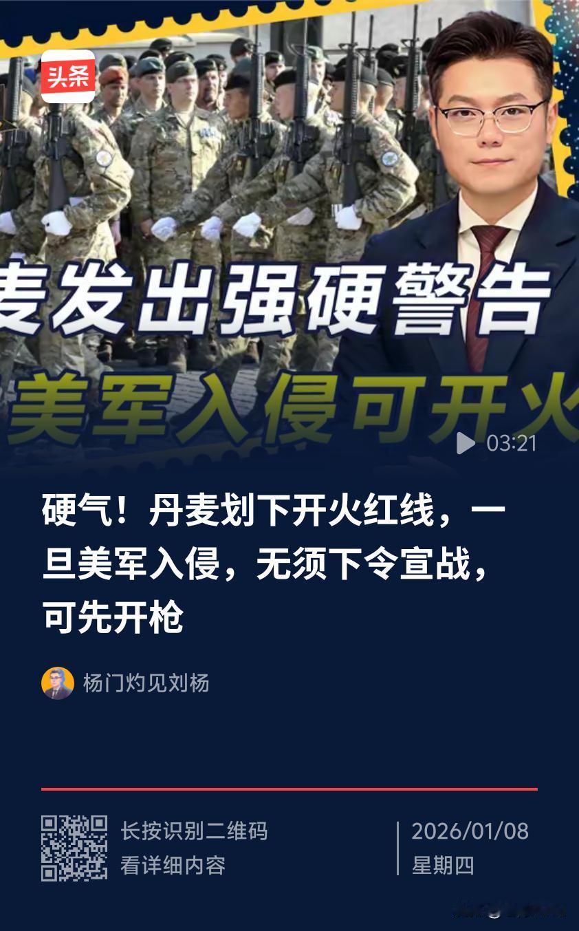 当地时间2026年1月7日,丹麦国防部表示,依据1952年生效军事规定,若美国武力夺取格陵兰岛,丹麦士兵可“先开枪再请示”。这一情况说明以下几点: 美国霸权行径引盟友不满 美国对格陵兰岛觊觎已久,早有购岛举动,2026年1月7日白宫新闻秘书莱维特称特朗普团队推进“收购”方案,“总统保留所有选项”,被指含武力夺取之意。美国为自身利益不顾盟友关系,其霸权主义和“美国优先”战略让盟友安全感缺失,丹麦此举是对美国霸权的强硬抵制。 北约内部裂痕加深 北约以“集体防御”为宗旨,美国作为盟主威胁盟友丹麦,使北约内部矛盾凸显。丹麦此举让北约成员面临两难,若美国动武,其他成员按条约应保护丹麦,这可能引发北约内部“法理内战”,导致联盟分裂。法国、德国等七国联合声明捍卫格陵兰主权,反映出欧洲对美国信任降低,凸显北约危机。 欧洲国家自主意识觉醒 美国威胁格陵兰岛使欧洲意识到,美国为利益可能损害任何欧洲国家。欧洲多国表态支持丹麦,显示出欧洲为维护自身利益和主权,开始摆脱对美国过度依赖,追求战略自主。 国际秩序面临挑战 美国将军事手段列为夺岛选项,公然蔑视国际秩序和国际法。其行为可能引发地区不稳定,冲击现有国际秩序,促使其他国家重新审视与美国关系及国际合作模式。