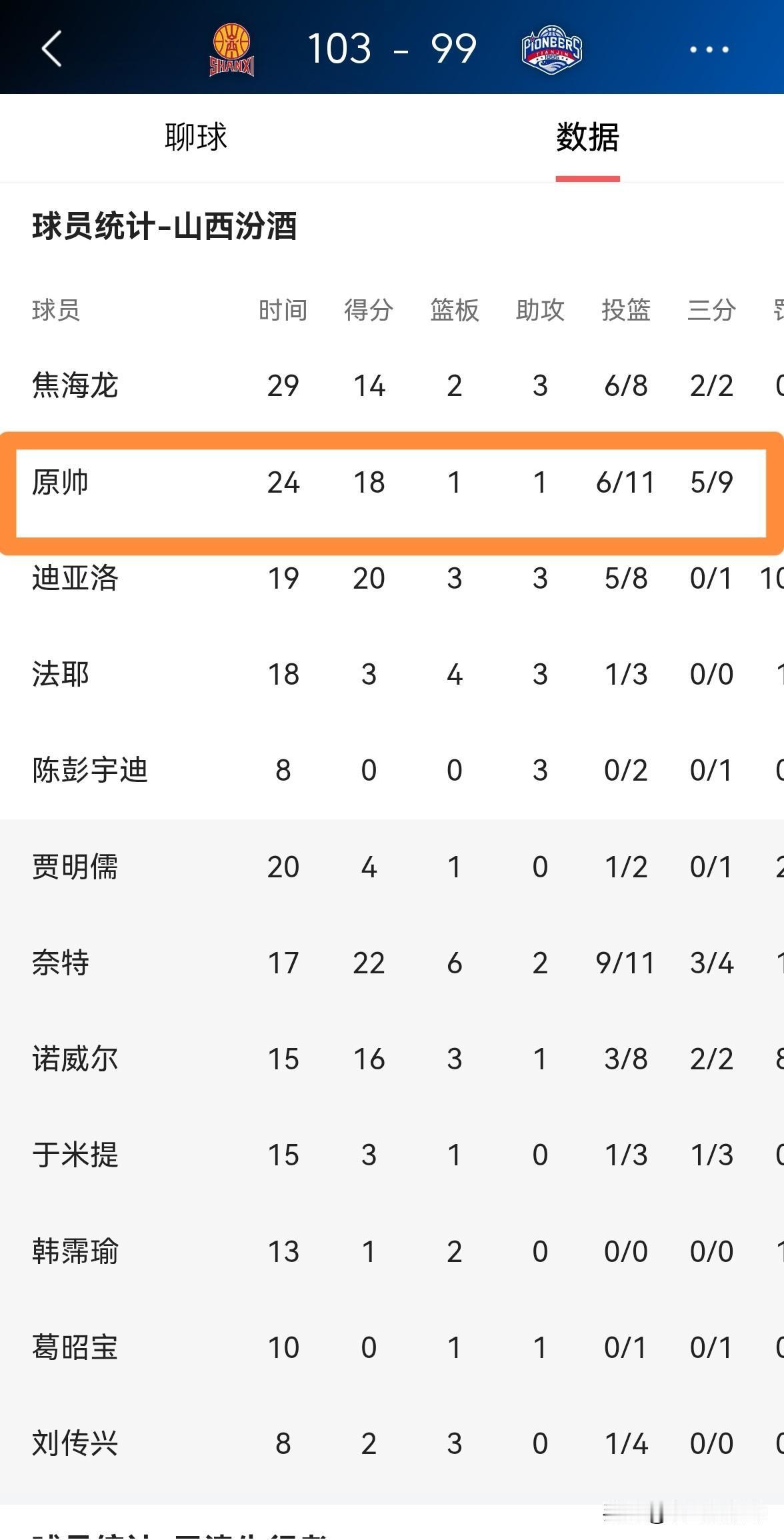 我一定要怒赞山西汾酒神射手原帅!在今天山西汾酒主场以103:99逆转击败天津先行者的比赛中,原帅在关键的第四节比赛中豪取11分,展现出了一名超级射手的能力和风采。 全场比赛下来,原帅首发出战24分钟,投篮11中6,其中三分球9我5、罚球1中1得到18分,还有1篮板1助攻,没有出现任何的失误,他的场上正负值为+9。 最让人感到不可思议的是,在第四节比赛中原帅犹如斯蒂芬-库里附体一般,投篮5中4,其中三分球4中3极其高效的砍下11分,成为了球队获胜的大功臣。