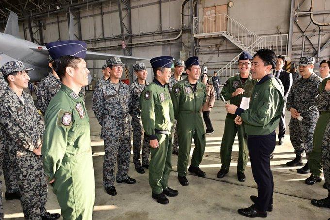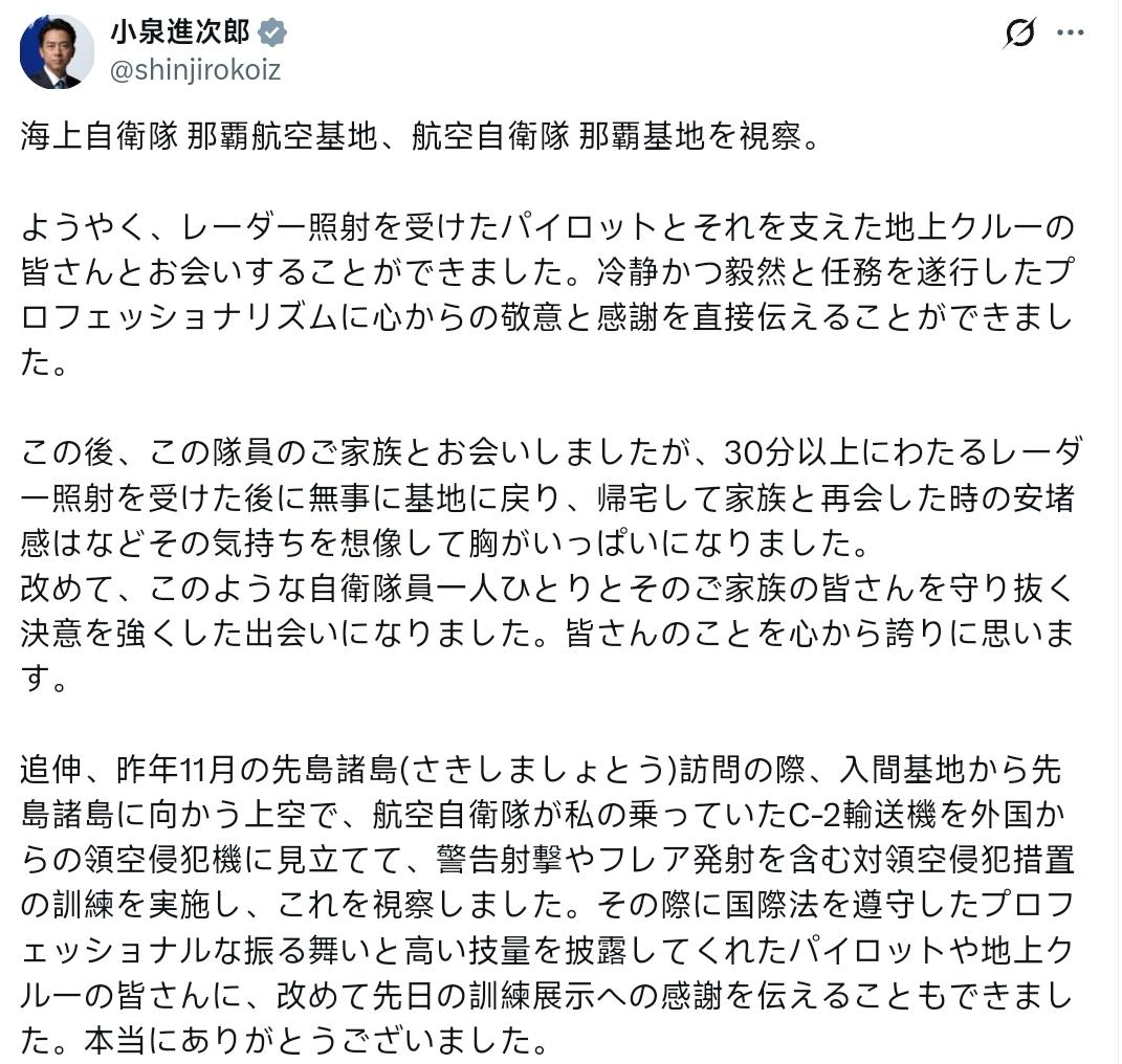 小泉进次郎:视察了海上自卫队那霸航空基地、航空自卫队那霸基地。终于,能够见到受到雷达照射的飞行员以及支持他们的地面机组人员了。我亲自向他们传达了对冷静且坚决执行任务的专业精神由衷的敬意和感谢。之后,我与这位队员的家人见了面,想象着在遭受30分钟以上的雷达照射后安全返回基地、回家与家人团聚时的安心与释怀,那种心情让我胸中满是感慨。再次,这次相遇让我更加坚定了守护每一位自卫队员及其家人的决心。大家的事迹让我由衷感到骄傲。追伸,去年11月访问先岛诸岛(さきしましょとう)时,从入间基地飞往先岛诸岛的上空,航空自卫队将我乘坐的C-2运输机模拟为外国领空侵犯机,实施了包括警告射击和投放照明弹在内的对领空侵犯措施训练,我对此进行了视察。当时,向我展示了遵守国际法的专业行为和高超技艺的飞行员和地面机组人员,这次我再次向他们传达了对前几天训练展示的感谢。真的非常感谢。
