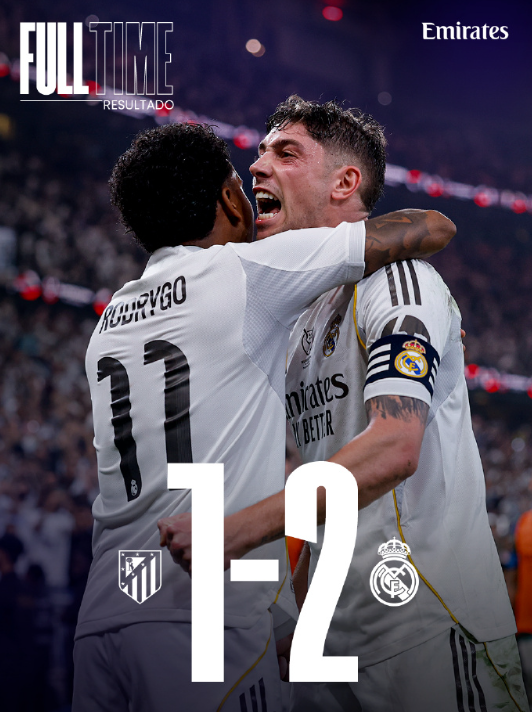 全场比赛结束,皇马2-1战胜马竞,晋级西超杯决赛 上半场巴尔韦德世界波破门先开纪录 下半场巴尔韦德助攻罗德里戈再下一城