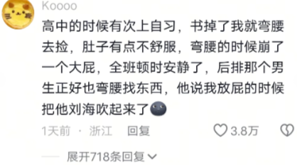 高中的时候有次上自习,书掉了我就弯腰去捡,肚子有点不舒服,弯腰的时候崩了一个大屁,全班顿时安静了,后排那个男生正好也弯腰找东西,他说我放屁的时候把他刘海吹起来了