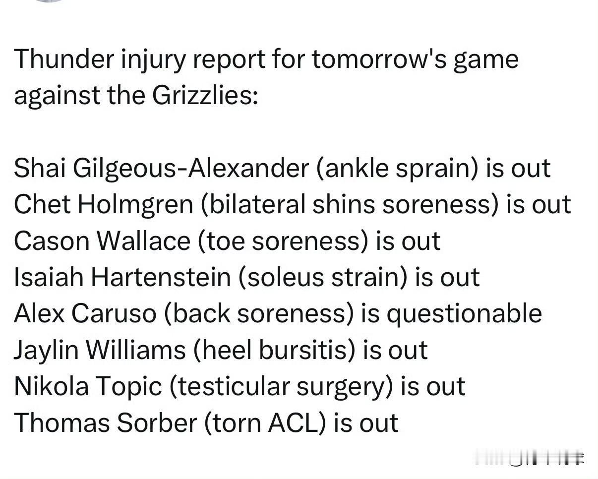 大面积轮休!雷霆队彻底看开了! 明天上午9点,雷霆队将做客孟菲斯挑战灰熊队。今天,雷霆队官方公布了球队最新的伤病报告(见图二),亚历山大、霍姆格伦、华莱士、哈腾、杰林都将因伤缺阵。 雷霆队一下子轮休了亚历山大和霍姆格伦两大核心,这情况为本赛季首次。看来,他们已经基本上放弃了去打破勇士队73胜9负的历史记录。在赛季初豪取24胜1负的开局后,雷霆队一时间风头无二,大家都认为他们会打破勇士队的历史记录,强大的期盼也伴随着巨大的压力,雷霆队在此以后仅取得了7胜6负的战绩,舆论很快两极反转,嘲讽谩骂和质疑声接踵而来,整支球队上到管理层、下到球员都背负着很大的压力,这反而让雷霆队无法招架,即使他们依旧排名联盟第一位,是总冠军的最有力争夺者。 如此一来,何不彻底放下包袱,专注于保障球员健康和卫冕总冠军。尤其是当家球星亚历山大,本赛季至今仅仅缺席了1场比赛,为了打破记录一直带着肘部伤势强行出战比赛,如今也终于可以好好休息养伤了。只专注赢球记录不一定是好事,勇士队当年拼尽全力拿下73胜9负的历史最佳战绩,最后也只是为骑士队做了嫁衣罢了,前车之鉴,雷霆队可别重蹈覆辙。