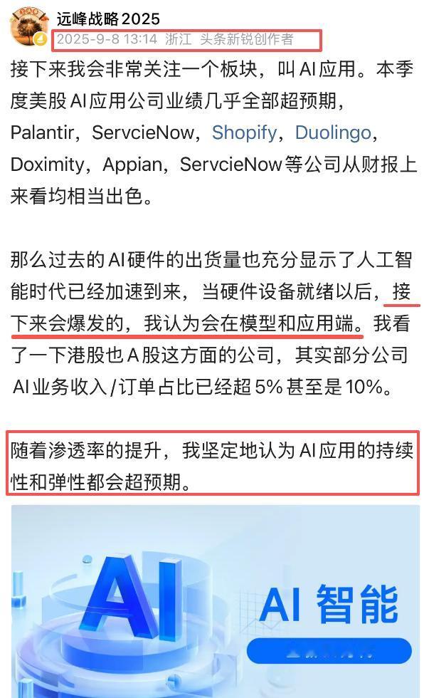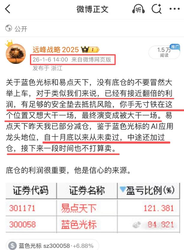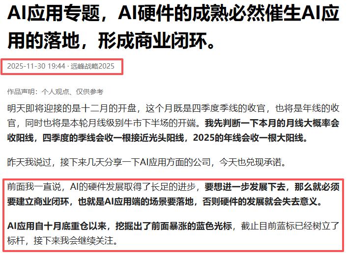 今天蓝色光标和易点天下统统再次大涨创出新高,蓝色光标近10厘米,易点天下20厘米封板。AI应用从去年开始一直布局,现在终于迎来重要的收获季。从过往截取的部分文章中,足见我对AI应用的重视,对蓝色光标的重视。 在去年九月的时候,我说过当硬件设备就绪以后,接下来会爆发的,我认为会在模型和应用端。我看了一下港股也A股这方面的公司,其实部分公司AI业务收入/订单占比已经超 5%甚至是10%。奈何当初听进去的人并不多。 在去年12月底的时候,我记得反复地说过,AI应用在2026会是一个大年。因为AI的硬件发展取得了长足的进步,要想进一步发展下去,那么就必须要建立商业闭环,也就是AI应用端的场景要落地,否则硬件的发展就会失去意义。 今天不少朋友又能加上鸡腿了,出来吼一下我看看多不多?