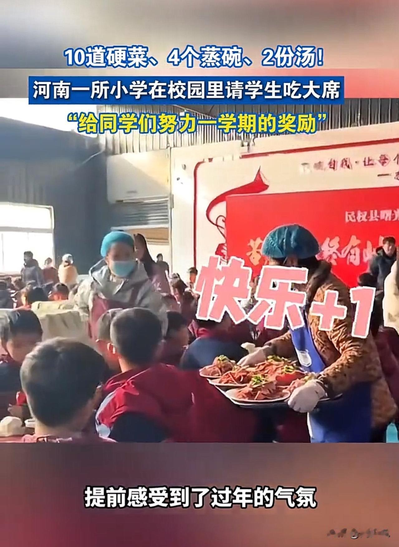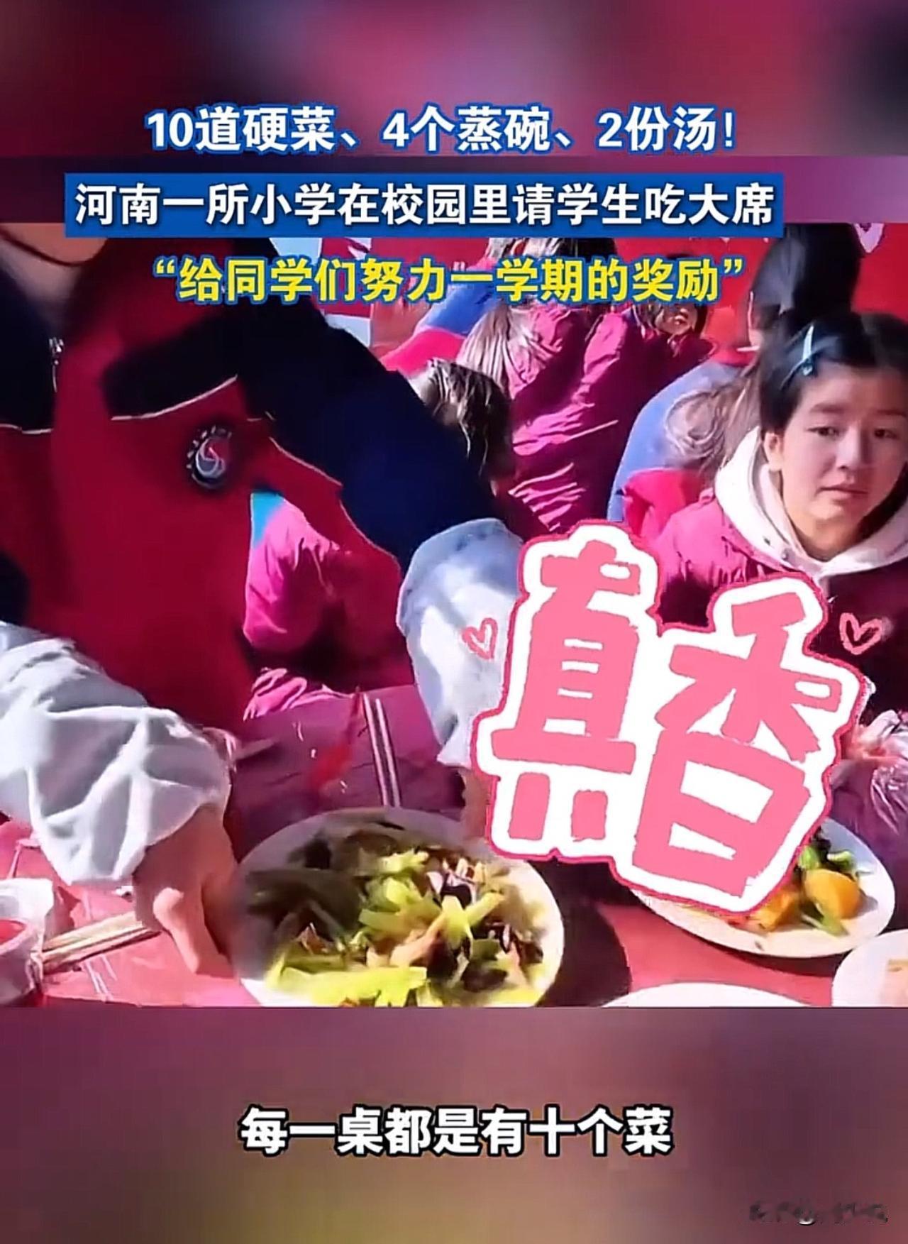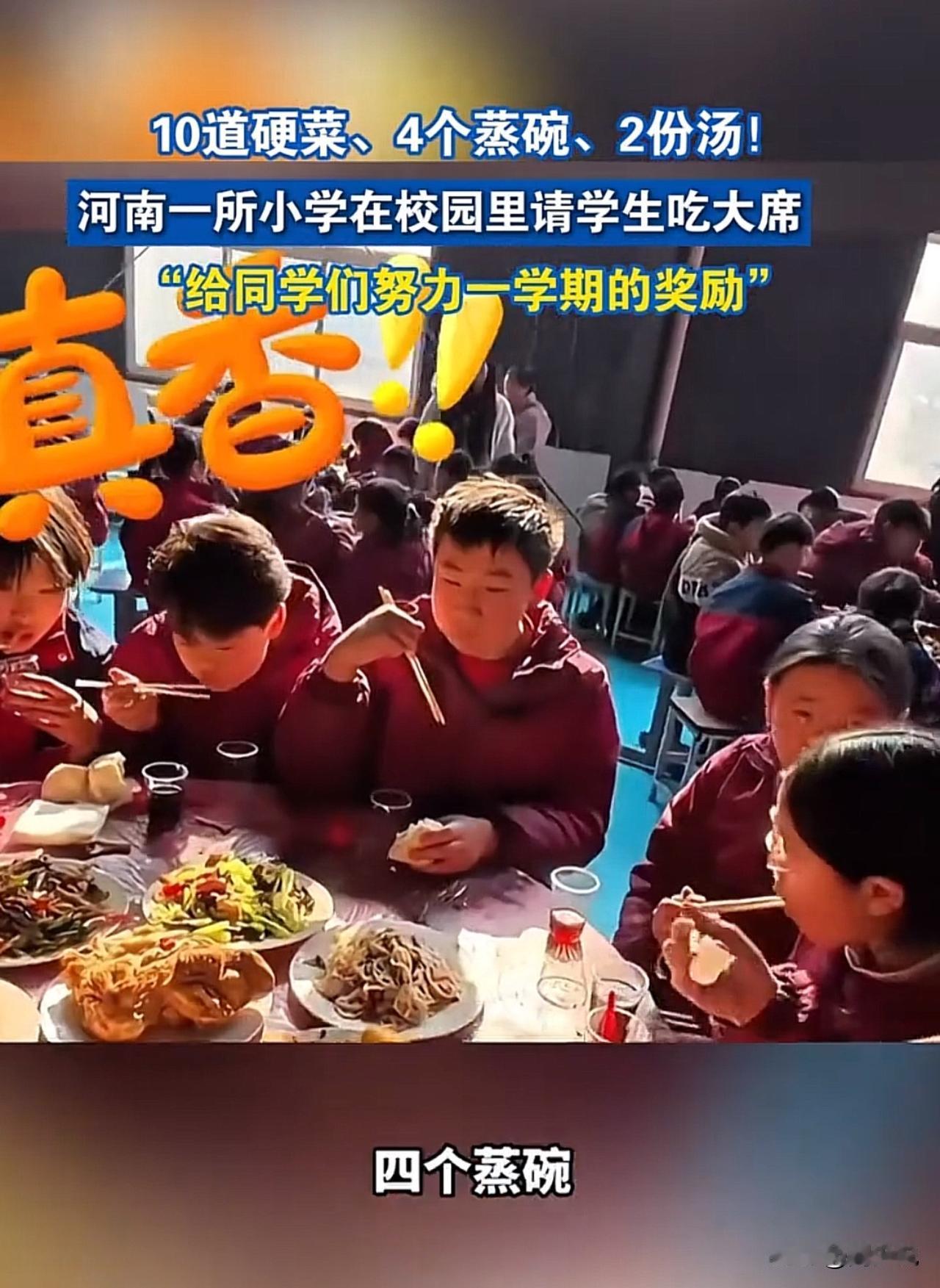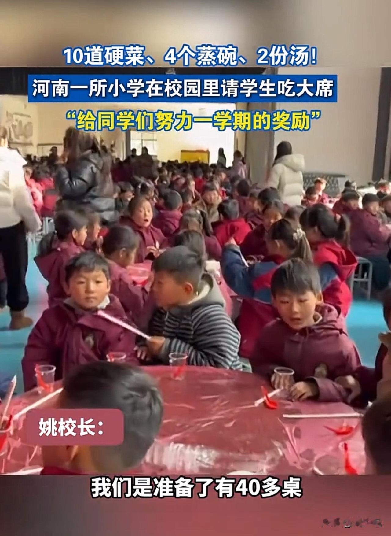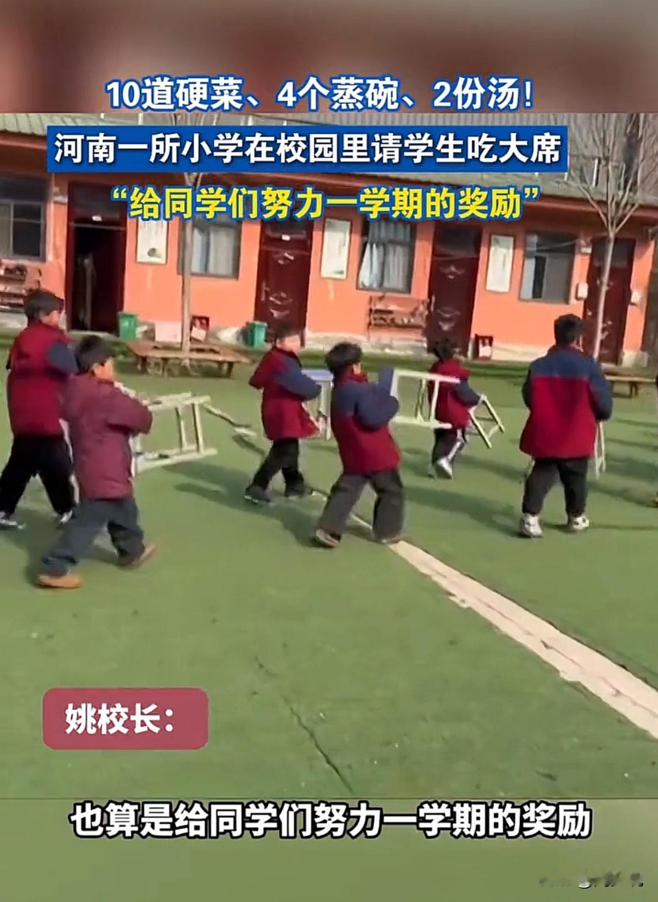 这太靠谱了!哈哈哈哈!河南一所小学为奖励全校师生一学期的努力,学校直接在校园里摆起四十多桌大席,提前让大家感受过年的热闹氛围。 据校长透露:每桌标配10道菜,既有4道地道蒸碗,又有2份暖心靓汤,再配上满满当当的硬菜,分量足、滋味浓。视频里,孩子们吃得眉开眼笑,不停夸赞饭菜喷香,满校园都是欢声笑语。 看到这一幕,周少觉得,这波操作实在太赞!没有华而不实的形式,用一顿热热闹闹的大席犒劳师生,比起空喊口号,这样的奖励才更接地气,也更能让人记在心里。#寻美三湘# #长沙新朋友#