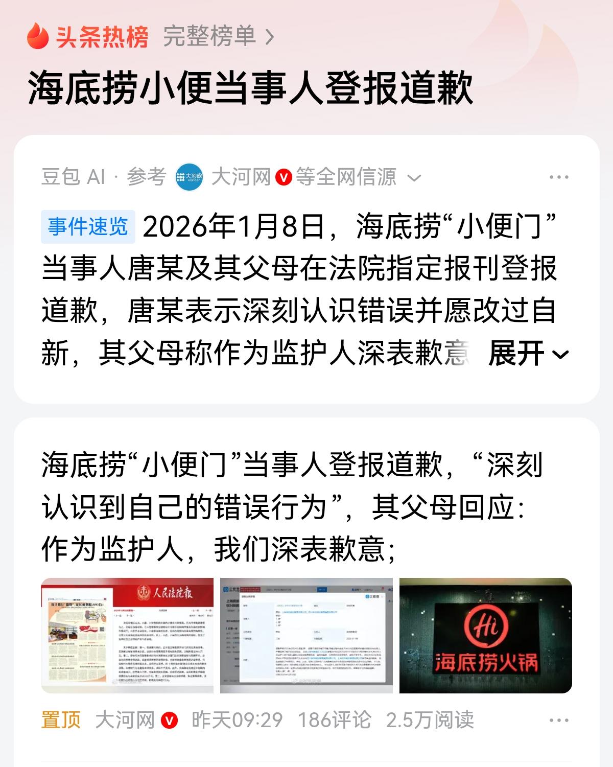 各位还记得去年闹得 沸沸扬扬的海底捞“小便门”吗? 时隔大半年终于等来后续了 当事人和家长终于登报道歉了, 但一句晚来的“深感愧疚” 会不会有点过于简单草率了 未成年人犯错, 确实可以给也应该给他改正的机会, 但迟到的歉意, 早就没了该有的诚意! 这事暴露出的根本不是孩子的一时糊涂, 而是家庭教育的严重缺位! 家长平时没教会孩子要敬畏公共规则, 没告诉他什么叫“己所不欲勿施于人”, 出事了就想着躲起来等风头过了, 就啥事没有了! 然而现在时隔半年又出来道歉, 是不是迫于舆论压力之下的无奈之举? 你们觉得呢?