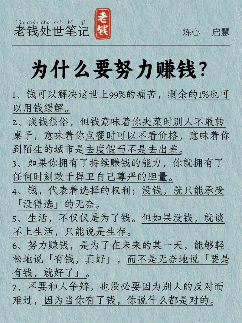 你努力工作挣钱是为什么? 你努力工作挣钱,是为了什么?这个问题,或许在我们每天奔波的生活中,被渐渐遗忘了答案。有人说,是为了买房买车,过上体面的生活;有人说,是为了给家人更好的未来;也有人觉得,只是为了那一份稳定的收入,换取片刻的安心。但真正驱动我们努力的背后,或许藏着更深层次的东西。 在这个快节奏的时代,很多人都在拼命追赶“更好的生活”,但你是否曾静下心来问自己:我努力的意义到底是什么?是为了追求社会的认可?还是为了填补内心那份空虚?又或者,是为了证明自己在这个世界上的存在感?这些问题,似乎比薪水单上的数字更重要。 其实,努力工作的动力,很多时候源自人性中那份渴望被认可、被理解的需求。我们希望通过自己的付出,赢得别人的尊重和肯定。无论是老板的赞赏,还是家人的微笑,都是我们坚持下去的最大动力。可是,当一切变得平淡,甚至觉得“努力无望”时,我们是否也会迷失在这条看似没有尽头的奋斗路上? 更深层次的原因,是对自我价值的追寻。每个人都希望自己活得有意义,有价值。努力工作,不仅是为了赚取生活的必需品,更是为了在这个世界上留下自己的痕迹。那一份付出,背后其实藏着我们对人生的思考——我是谁?我想成为什么样的人?我是否在用自己的方式,活出了真正的自己? 但值得反思的是,努力工作也要懂得平衡。不要让“拼命”变成了“迷失”。我们需要在追求梦想的同时,照顾好自己的身心健康,陪伴在爱的人身边。因为,生活的意义,不仅仅是金钱的堆积,更是那些细碎而温暖的瞬间——一顿家常菜,一次真心的对话,一场说走就走的旅行。 所以,朋友们,你努力工作的意义到底是什么?或许答案在你心里早已清楚。别让忙碌掩盖了你内心的渴望,也别忘了,真正的成功,不只是账上的数字,而是你在奋斗中找到的那份平静和满足。愿我们都能在努力的路上,找到属于自己的光,活出最真实的自己。 挣钱意义 上班工作意义 挣钱