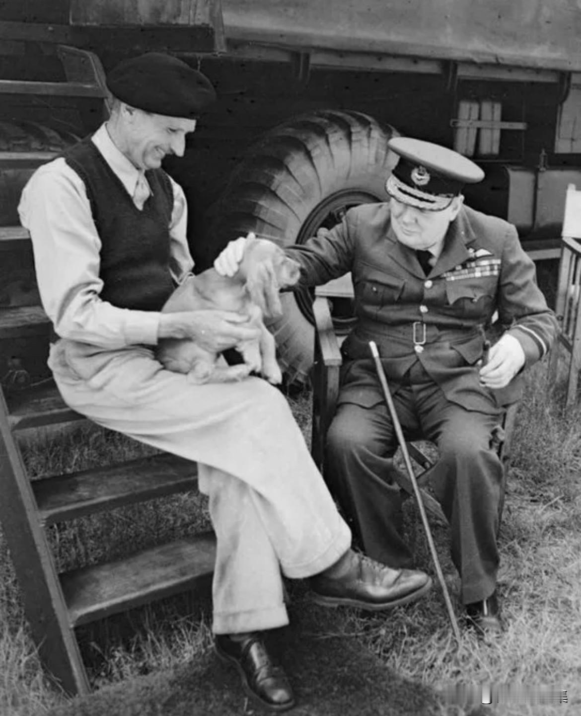1944年8月7日,英国首相丘吉尔在诺曼底战役期间访问位于法国布莱的盟军第21集团军群总部,与蒙哥马利将军会面。当时蒙哥马利养有一只名为“隆美尔”的可卡犬,丘吉尔在视察间隙与这只猎犬互动,留下了历史性的轻松时刻。这只猎犬之所以取名“隆美尔”,源于蒙哥马利在北非战场击败德国名将隆美尔后,以对手名字命名自己的宠物,带有军事胜利的象征意义。值得一提的是,蒙哥马利当时还养有另一只名为“希特勒”的猎狐梗。