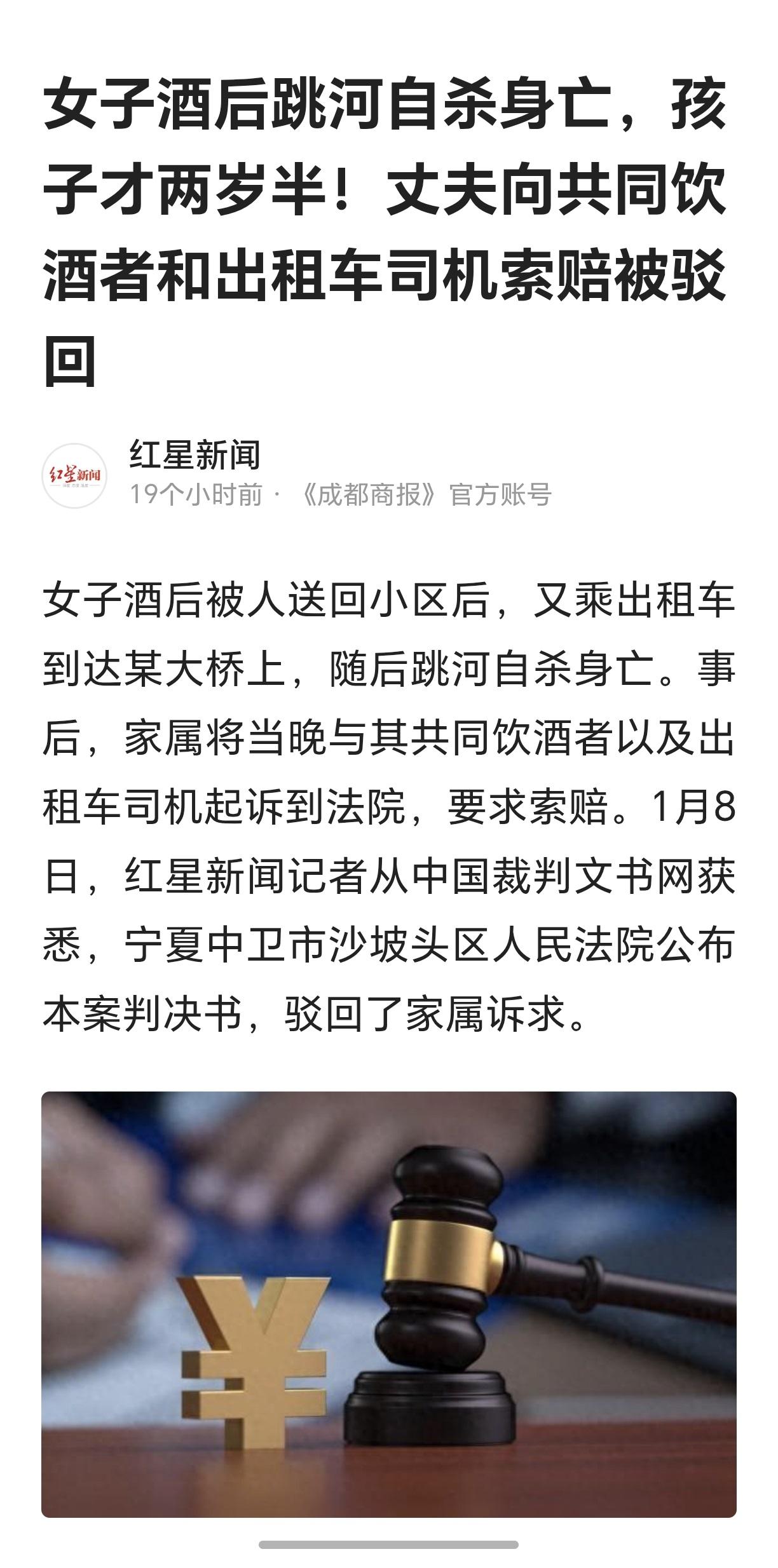 两岁半孩子的妈妈离开酒吧,徘徊在大桥上,被姐夫送回小区后,又打的到大桥上,坠河身亡。她的丈夫起诉同饮者和出租车司机,要求赔偿14万元。法院会怎么判?   事情发生在去年5月的一个下午,宁夏中卫,年轻妈妈邵某兴致勃勃地约闺蜜吃米线,到酒吧唱歌、喝酒。   三瓶啤酒下肚,邵某觉得不尽兴,又邀请了姐夫康某和朋友冯某一起对饮。几轮下来,邵某已有醉意。   到了晚上21点,邵某说:“你们喝,我走了”,便离开了酒吧。   一小时后,康某打电话问邵某是否到家,得知她在某大桥上,不放心,就打的找到在桥边徘徊的她,送回小区门口,目送她走进大门后离开。   当晚23点,丈夫通过微信视频看到妻子邵某“喝多了”,叮嘱她小心,却没有下楼迎接。   谁知丈夫左等右等,不见妻子上楼,后来才得知,通话后,妻子转身打的回到了大桥,不久坠河身亡。   邵某为何选择结束生命,这背后的隐情,我们无从知晓。   但我们知道,她两次出现在那座桥上,内心一定万分挣扎,而之前的饮酒唱歌,都是在试图寻找内心的出路。   可惜,她没有找到出路,选择了离开,永远离开了她的孩子。   悲剧发生后,丈夫把当晚和妻子一起喝酒的亲友,以及拉她到大桥上的出租车司机都告了,要求共同赔偿14万余元。   丈夫认为这些被告都存在过错,康某等人没有把妻子安全送进家门,司机不该深夜把醉酒的人拉到大桥这种危险的地方。   不过,他失望了。近日,法院判决驳回他的诉讼请求。   因为法律对相关人员的责任边界有清晰的、审慎的划定。   一起喝酒的朋友中,有的人没有饮酒,有的人早早离开,姐夫康某把她送到了小区门口,目送其进入大门,已经尽到朋友的护送义务。   而出租车司机应邵某要求,把她送到大桥,继续“唱歌喝酒”,没有发现她有轻生等异常迹象。   司机不可能拒绝一个表达清晰、言行无异常的乘客的要求,否则还可能被认定为拒载,遭到投诉。   更何况法律讲因果关系,讲证据和举证责任。   丈夫没有证据证明同饮者存在着劝酒、灌酒等不当行为,相反,众人可以证明是邵某主动邀请大家共饮。   丈夫也不能证明司机有违规操作。在没有其他证据的情况下,法院只能认定邵某跳河是自主行为,并非意外,也不是其他人造成的。   所以,这位丈夫不该苛责他人,而应反思,自己明知妻子喝多了,为何没下楼扶一把?为何没发现妻子近来的情绪异常?   多一句问候和一次搀扶,或许妻子就有了迈入家门,重新开始的勇气。   对此事件,你有何见解?欢迎到评论区留言。