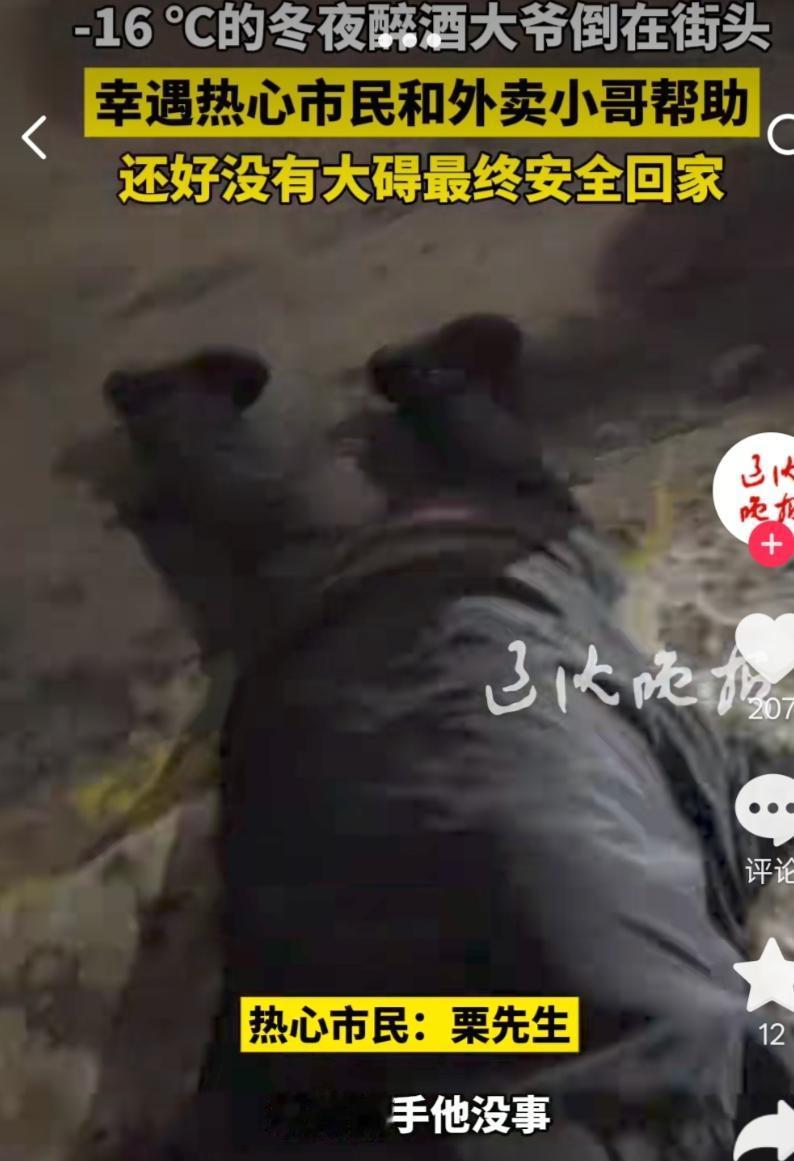 辽宁抚顺的夜里寒夜里的暖心事 隆冬腊月辽宁抚顺的夜里能冻透骨头,零下16摄氏度的天气,出门哈口气都能结成霜。 那天晚上,外卖骑手李春雷跑单路过绥化路,骑过去老远才发现路边好像蜷着个人。他赶紧掉头回去,凑近一看是位大爷趴在马路牙子上,上半身靠着石头,两条腿还横在路面上一动不动。 李春雷心里一紧,这大冷天的,在外面待久了可要命。 正好旁边还有位开车路过的大哥,两人一碰头,赶紧上前查看。 大爷喝多了,迷迷糊糊说自己没醉,身子却冻得僵硬。大哥赶紧报警,李春雷守在一旁,和大哥一起把大爷架起来坐稳,就怕他再摔着或者冻出好歹。 警车很快赶到,民警认出大爷是附近的居民老杜,直接把他送回了家。 事后美团平台给李春雷颁发了“先锋骑手”称号,还发了好人好事奖金。 其实骑手们风里来雨里去,挣的是辛苦钱,却愿意停下脚步帮陌生人一把,这份热心,配得上平台的奖励,也值得我们给这些平凡的好心人点个赞。