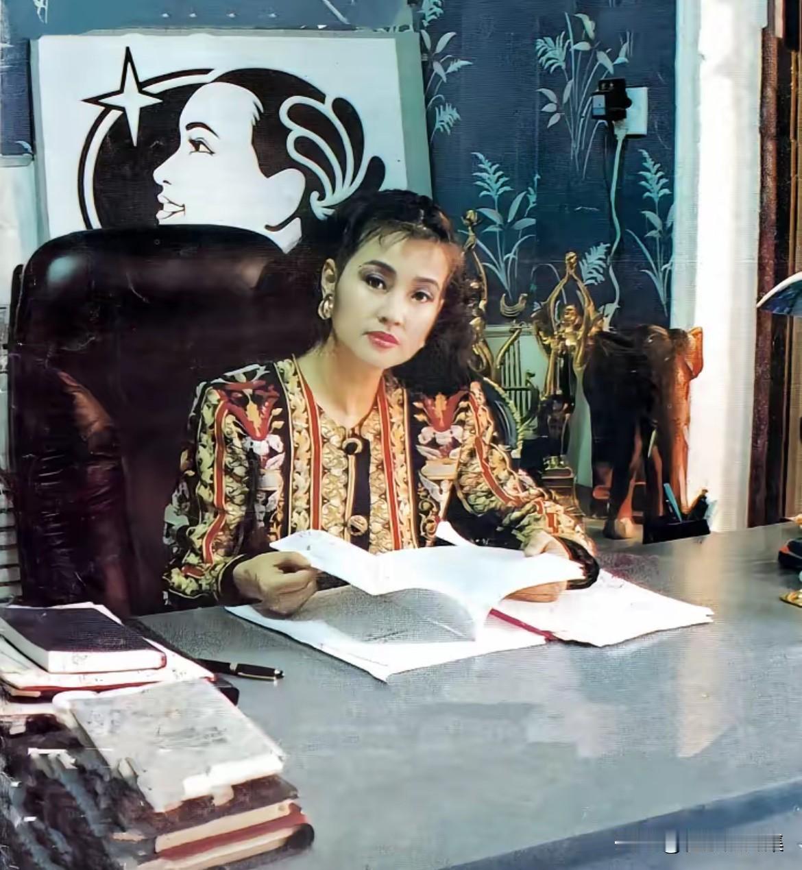 1990年代初,刘晓庆从影坛转向商界,成立北京晓庆实业发展总公司,业务横跨房地产、化妆品、影视等多个领域。图为刘晓庆在深圳办公室拍摄的照片。她通过融资、土地收购等方式迅速扩张,1999年登上福布斯中国富豪榜第45位,成为“亿万富姐”。