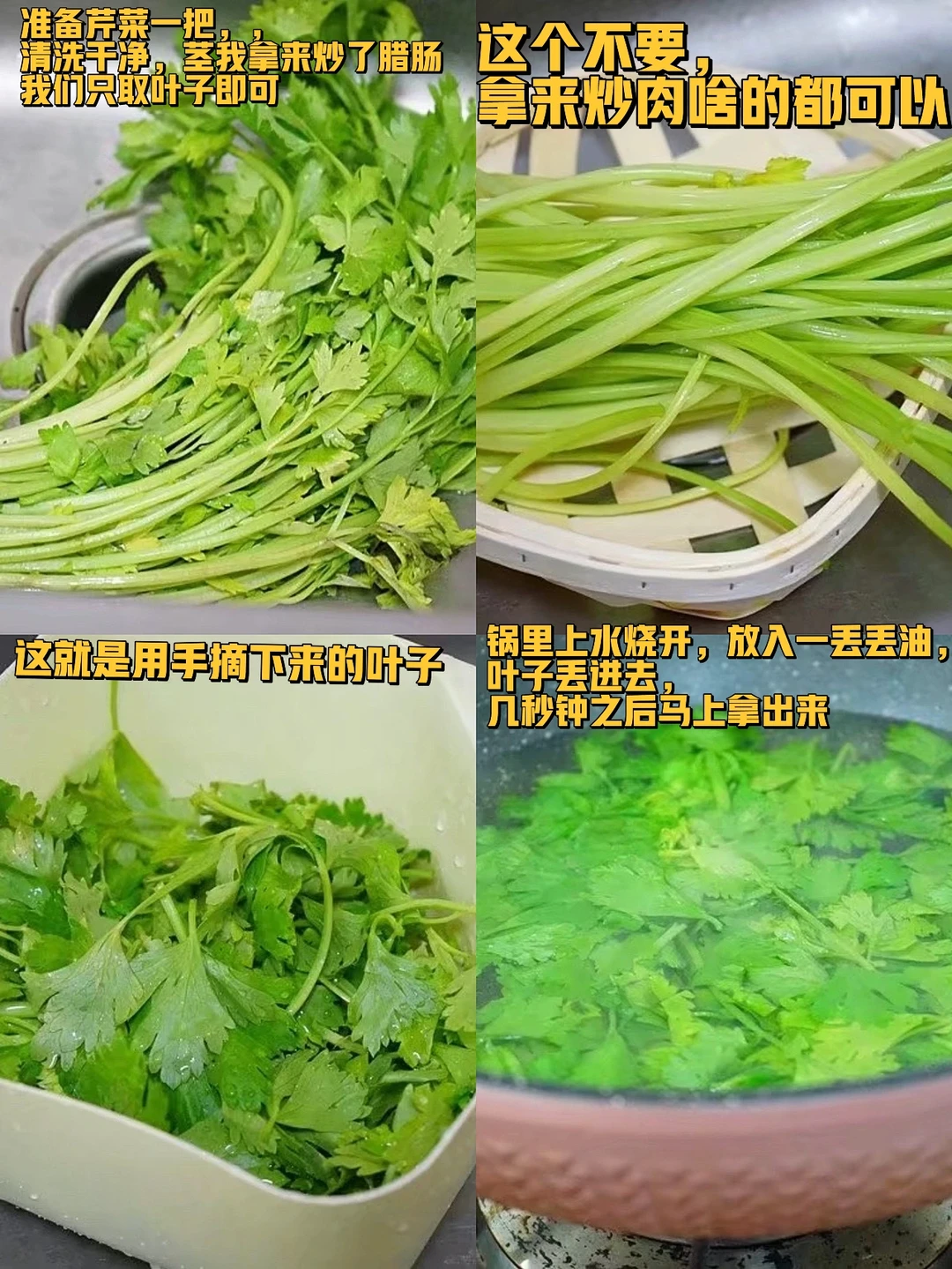 5. 准备芹菜一把,,清洗干净,茎我拿来炒了腊肠我们只取叶子即可