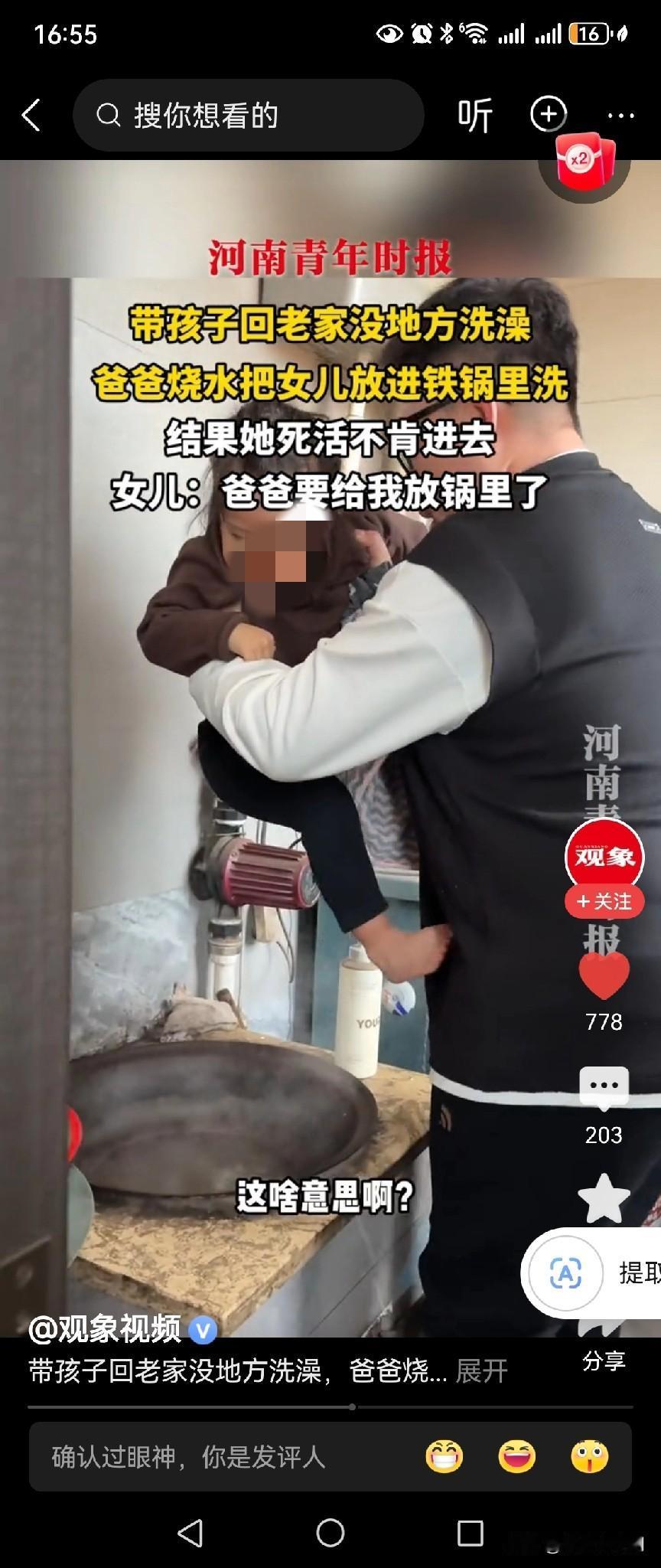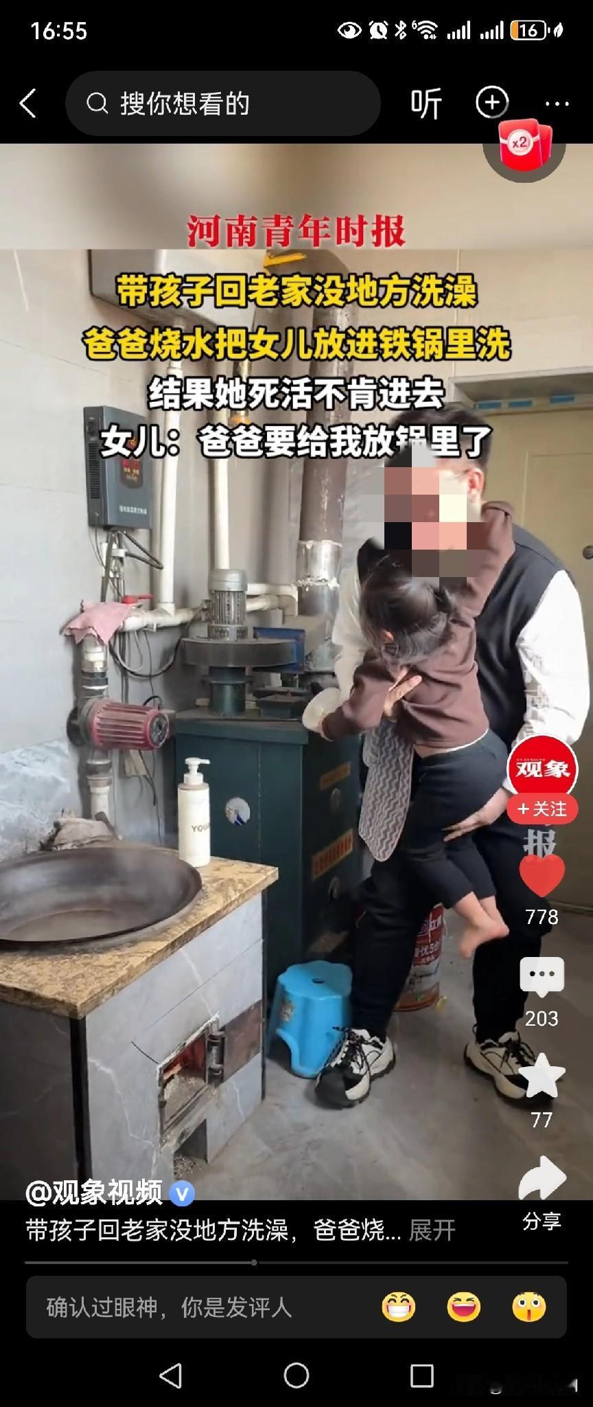 这场面让人想起了西游记 这不知道是哪里的风俗习惯,男子带女儿回老家,因为没地方洗澡,就在大铁锅里烧上热水,想把女儿放在铁锅里洗澡。 但女儿却死活不愿意到铁锅里,视频中看到男子把女儿抱起,女儿却紧紧抓住爸爸,还蜷起双脚抗拒,眼睛惊恐地盯着妈妈,希望妈妈出手援救。 这场面别说小女孩害怕,大人也有点胆颤心惊。脑子里第一反应是《西游记》中,唐僧被多次架到火上烹煮,旁边是急得馋涎欲滴,摩拳擦掌等着吃唐僧肉的众多妖怪。 有网友评论,说是少见多怪,他们家乡这样洗澡的挺多,下面有柴火余烬,还可保温。这是哪里的做法啊?没有地方洗澡,没有盆吗?以前没有塑料盆,也有木盆。 现在农村的生活条件也好了,自来水、热水器、淋浴设施也都很齐全,还用得着在铁锅里洗澡吗? 而且灶台供着灶神,民以食为天,踩踏灶台都会被大人训斥,怎么会让人在锅里洗澡,纵使用的不是饭锅、炒菜锅,也是对食神、灶神的不敬。 不知道是博主为了挣流量摆拍,还是真的有这样做的。大千世界,无奇不有。