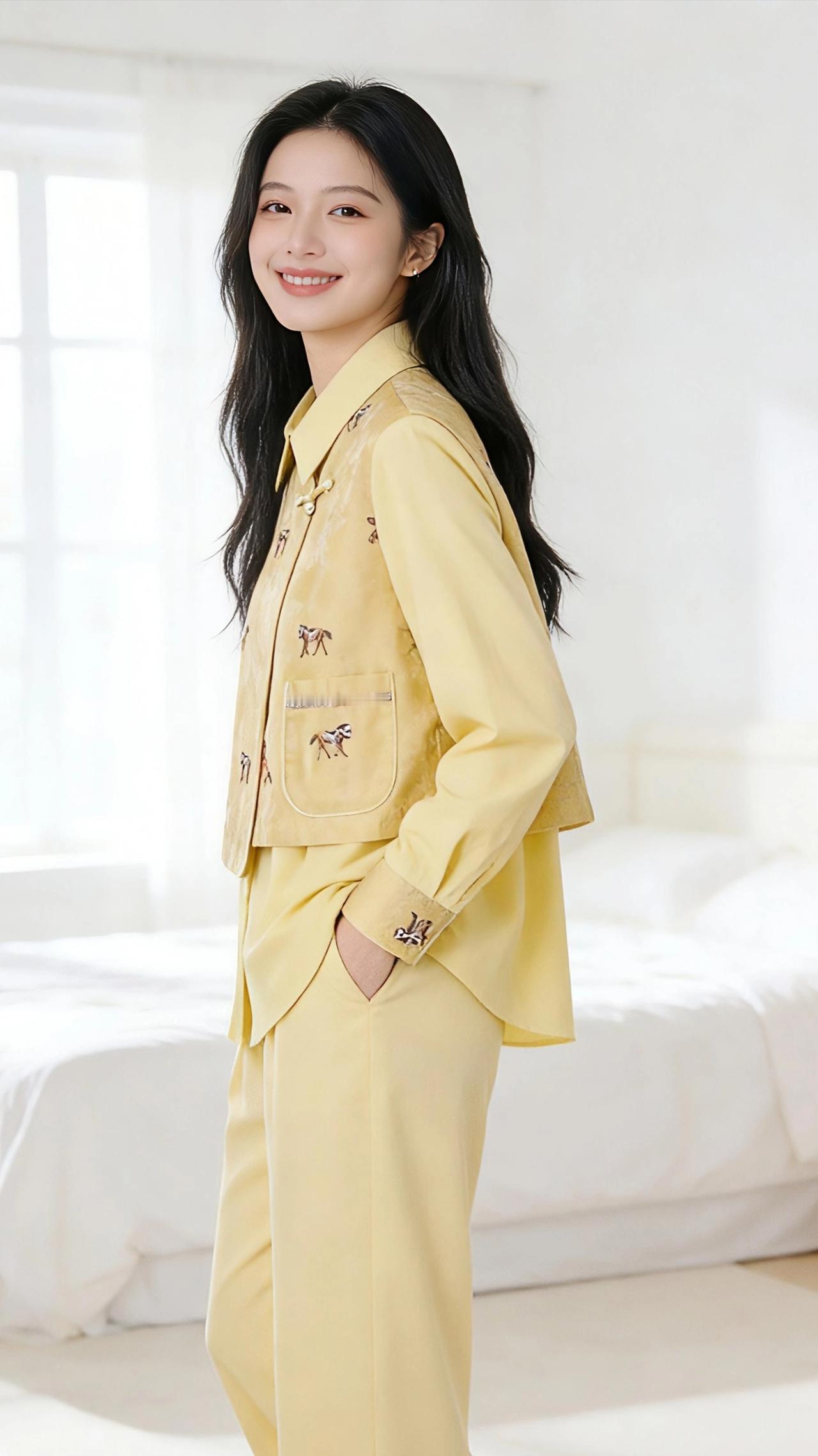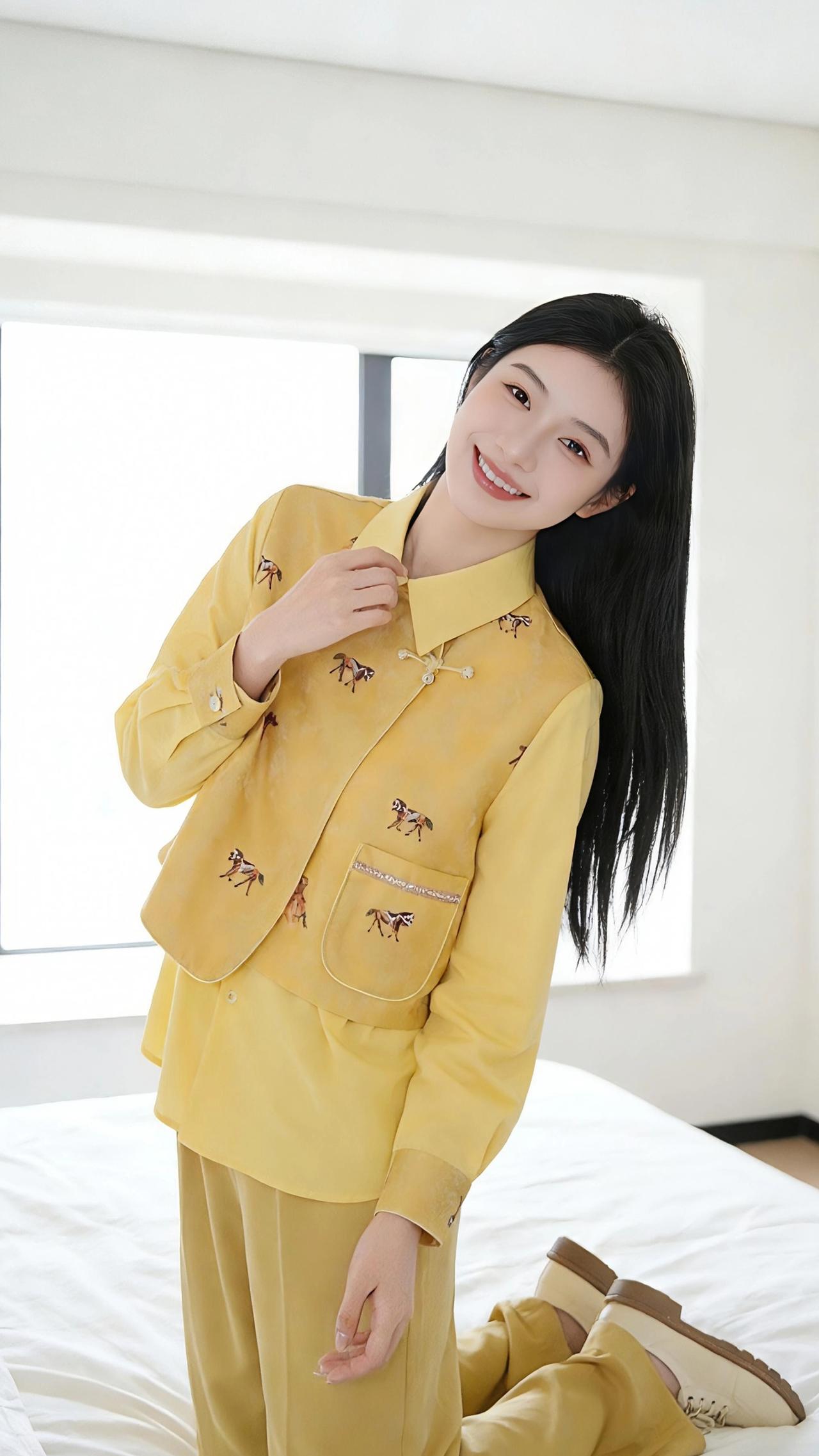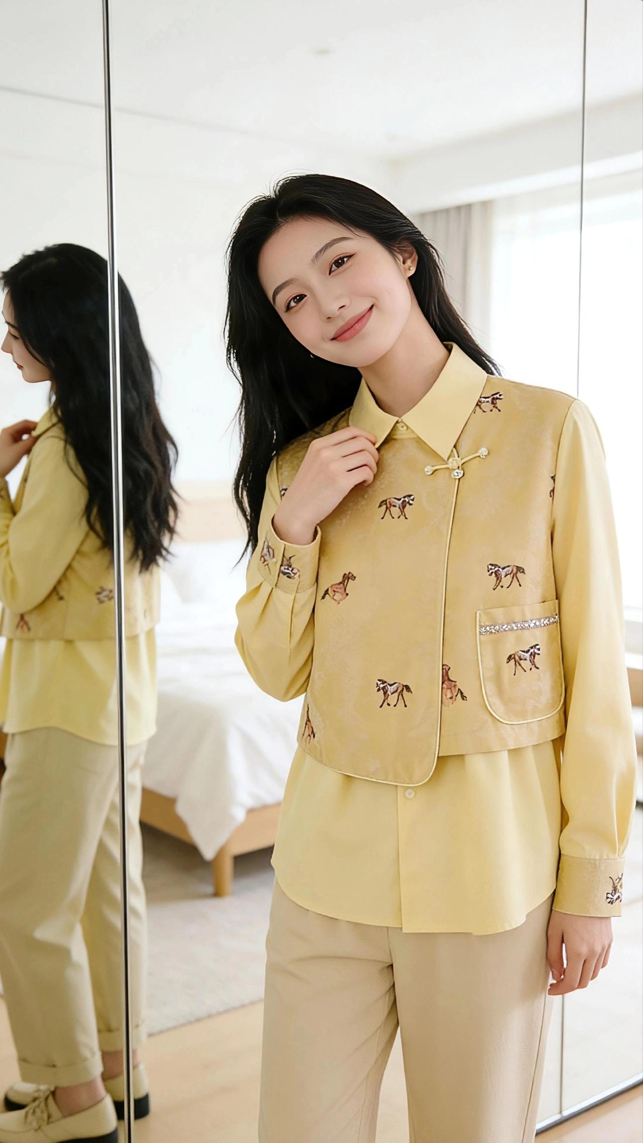 杏黄裁春,马影绣香 晨起的光穿过白纱窗,揉碎在杏黄色的衣袂上,像把初春的暖阳裁成了衣衫的模样。那层叠的衣摆似流云轻垂,盘扣如檐角的玉扣,轻轻一扣,便拢住了中式雅致的韵致。 衣身上的小马刺绣是藏不住的灵动,或扬蹄,或缓步,似从画里踱出来的小兽,踩着丝线的纹路,在杏黄的底面上留下细碎的欢腾。指尖抚过衣料,滑腻的触感像触到了江南的春水,而刺绣的针脚又带着手工的温软,让冰冷的织物也有了人情的暖意。 她立在镜前,指尖轻捻领口的盘扣,黑发垂落肩头,与杏黄的衣色撞出温柔的层次。转身时,衣摆轻扬,那些小马便似要踏着光影跑起来,在纯白的房间里,漾开一圈圈温柔的涟漪。蹲身时,衣料的褶皱叠成柔软的弧度,像将一捧春光拢在了膝头,而那绣在袖口的小马,竟像要探出头来,嗅一嗅窗棂外的清风。 这杏黄的衣衫,不只是布帛与丝线的拼接,更像把春日的温柔、中式的婉约,还有一丝少年意气的灵动,都缝进了方寸之间。抬手拂过衣摆的瞬间,仿佛握住了一缕不疾不徐的美好,在晨光里,与衣上的马影一同,醉在了这温柔的日常里。 高级感穿搭 新年穿搭 女装 穿搭