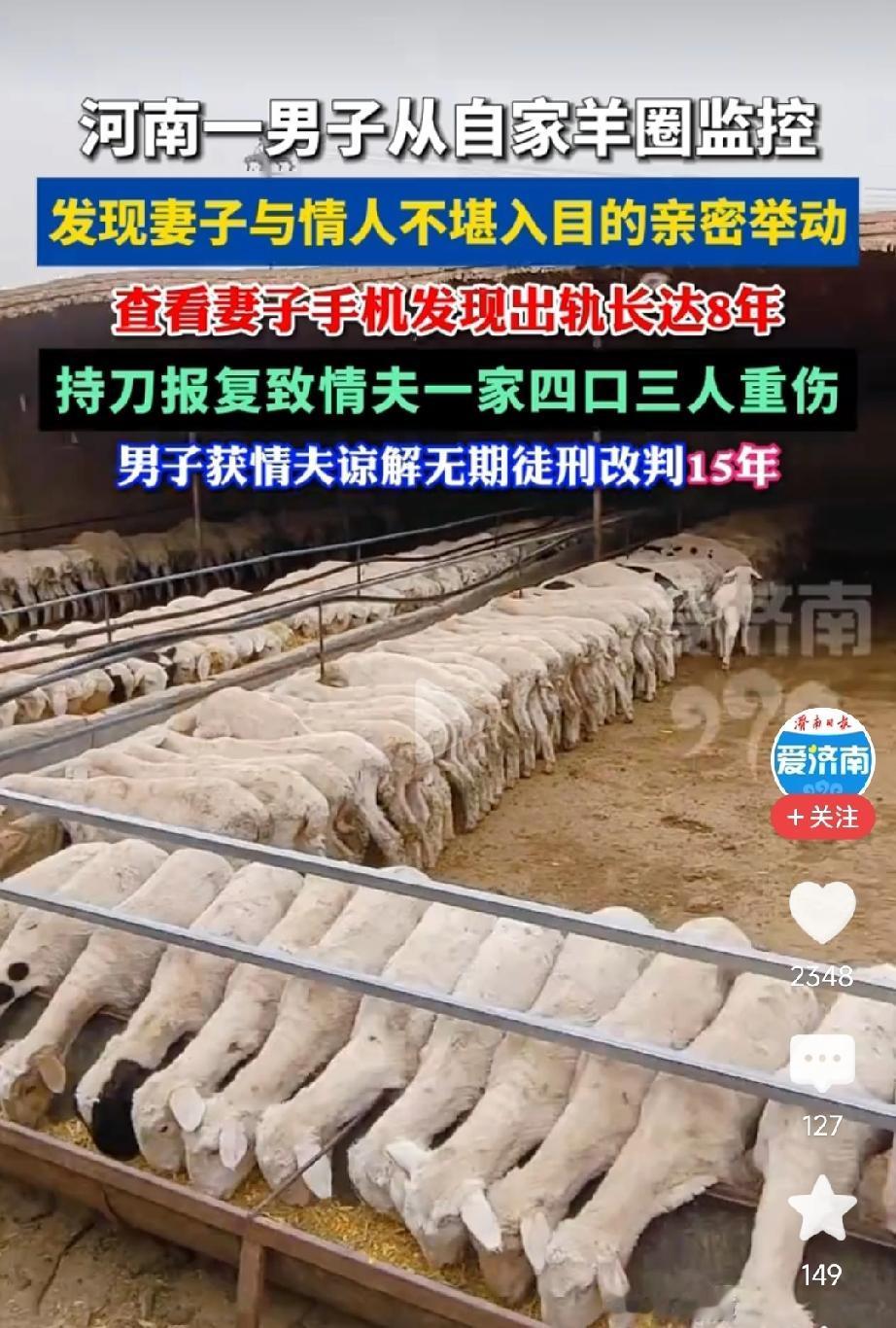 这哥们被戴了8年绿帽啊,彻底急眼了,重伤3人! 自古奸情出人命,不信你问西门庆!怎么个事呢?原来这位河南新乡哥们查看自家羊圈监控,发现了妻子出轨的事情。 后来妻子再次出轨,其一怒之下重伤情夫一家四口,其中三个重伤!后来情夫家属出具谅解书,其由无期改判15年! 这哥们还是太冲动了,大不了离婚,好女人多的是,出来以后还是好汉!