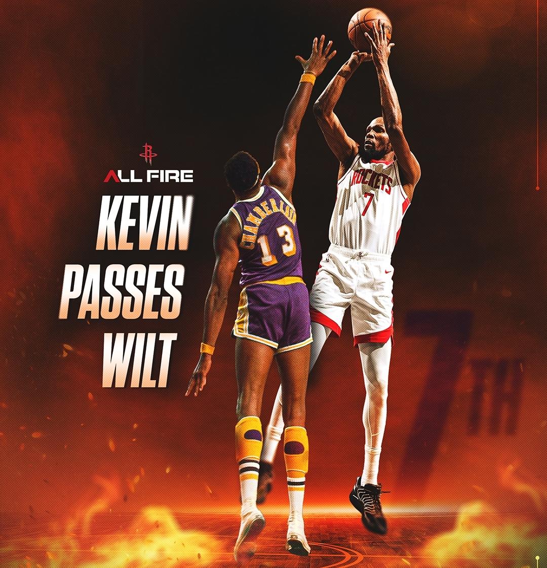 历史时刻!杜兰特总得分超越张伯伦上升至历史第7位。 北京时间1月10日,火箭与开拓者赛季三番战。赛前,杜兰特只要再得14分将追平张伯伦(31419分),得到15分将完成反超独占历史第7的位置。赛前杜兰特总得分为31405分。 首节,杜兰特4中3得到6分。次节,3中2,罚球4中4得到8分。易边再战,虽迟但到,在第三节进行至8分20秒时,杜兰特干拔三分命中,实现这一历史时刻。 而杜兰特还剩2年9000万美元的合同(27-28赛季)。本赛季目前,37岁的杜兰特场均仍然可以得到26.1分(赛前),同时只缺阵了2场比赛。 火箭队本赛季还剩48场比赛,杜兰特若出战余下40场比赛,就是1044分。余下两个赛季没有特殊情况下,每个赛季出战65场比赛,按场均23分计算,也有2990分。 那么,杜兰特这份合同结束后,生涯总得分有可能达到35439分,将超越诺维斯基(31560分),乔丹(32292分),科比(33643分)上升至历史4位。