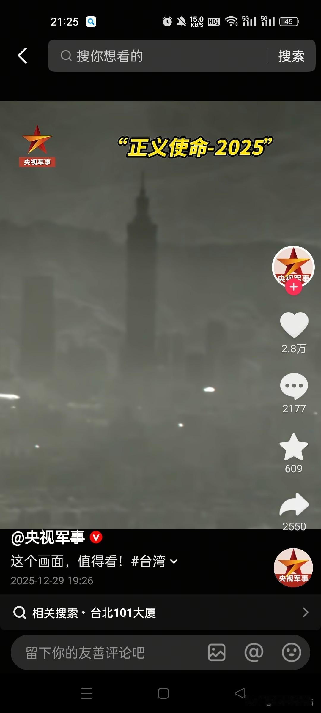 太激动人心了! 网络发了一段视频画面异常震撼, 让我心都跟着澎湃起来。 12月29号东部战区进行"正义使命-2025"联合军演,一架中国东部战区无人机在"台北101大厦"头上划过长空!异常震撼!真是厉害了我的国。 台湾地区连拦截都不敢,怕一旦拦截下来,就是自己的末日降临!中国就有足够理由进行收复台湾事宜。 我猜赖清德当时肯定躲在老鼠窝里不敢出来吧!怕一露头就被斩首。 这或许就是中国给台湾当局懒清德最后的机会吧!再不回头是岸,就会人头落地已。 看来台湾回归的日子不远已! "台湾儿子中国妈妈想你了,速归!" 台湾统一最有可能以什么样的方式 台湾