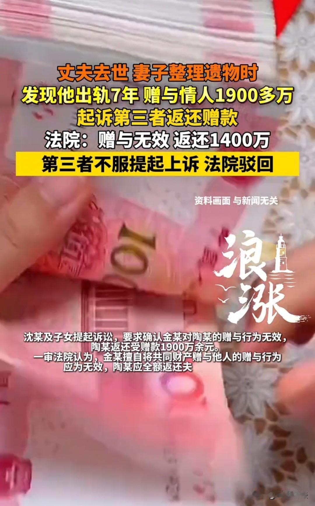 上海,妻子正在整理丈夫的遗物,却发现有1900万转给了同一个女子,她立即起诉要求返还,法院判决返还1400万,女子还不服提起上诉,最后,法院维持原判。 沈女士和丈夫金蒙是在1999年7月份结的婚,婚后两人特别恩爱,生育了一儿一女。 当时形势比较好,丈夫又比较聪明,就开始做起了生意。 在丈夫的合力经营下,生意越做越好,越做越大,夫妻俩的关系并没有因此破裂,反而越来越融洽。 他们知道挣钱容易,守钱难,都是从苦日子过过来的,所以特别珍惜金钱,也特别珍惜两人之间的感情。 可是天有不测风云,在2022年的时候,丈夫不幸离世了。悲痛不已的沈女士怎么也没有想到,丈夫会先离自己而去。 她忍着悲痛整理丈夫的遗物,想要再感受一下丈夫仅留下的一点点温存。 可是在整理的时候,竟发现有大额的转账单。 沈女士起先是愣住了,这些钱从没听丈夫说过,再仔细核对,发现款项全转给了同一个人。 看名字和信息,对方应该是一位女子,沈女士瞬间就明白了,前前后后这1900多万转给同一个女子,意味着什么。 两人并非生意关系,也没有任何生意来往,那对方只能是丈夫的婚外情人。 虽然这些年沈女士没有管理公司的事情,但大客户她还是知道的,而这位女子,她从来没有接触过,更没有听说过,因此,她认定丈夫在世时背叛了自己。 随后,沈女士立刻从失去丈夫的悲痛中抽离出来,拿着证据到法院起诉,要求对方归还这1900多万。 陶女士接到起诉书后,一脸茫然,她以为这些钱会随着金蒙的离世永远隐瞒,谁知道会被金蒙的妻子发现。 本想着拿着这些钱好好过后半生,结果却被要求返还,她怎么也接受不了。 自己好歹从2015年就和金蒙相处,前后七年,她也付出了不少。 可沈女士才是金蒙的合法妻子,丈夫赠与他人的钱财属于夫妻共同财产,不能因丈夫单方面赠送就合法,必须予以返还。 陶女士不服,称她和金蒙之间有经济往来,并非金蒙单方面付出,她也转过钱给金蒙。 工作人员要求她提供证据,不能仅凭一面之词,所有的陈述和主张都需要证据支撑。 最后,陶女士只拿出了一份证据,证明自己曾转给金蒙540万。 既然有证据支撑,法院便从1900多万的转账记录中扣除这540万,判令陶女士返还沈女士1400万。 陶女士不服判决,提起上诉,认为自己七年的付出付诸东流,怎么想都不划算,觉得判决不合理。 不过,二审法院维持原判,驳回了陶女士的所有诉讼请求。 这也给大家提了个醒:不是自己的东西,千万别贪念,想靠着投入感情换取不正当收益,最后终归是一场空。 一、沈女士和金某是夫妻关系,金某将1900多万转给了陶女士,为什么要求的是全部返还,而不是返还一半呢? 《民法典》第1062条,婚内生产经营收益属夫妻共同财产,双方有平等处理权; 《民法典婚姻家庭编解释(二)》第7条,一方因婚外情赠与共同财产,另一方主张无效法院应予支持。 共同财产不分份额,单方赠与无效,非部分无效,故需全额返还而非仅返一半。 二、陶女士这七年也付出了感情,为什么就1分钱都拿不到呢? 《民法典》第153条第2款,违背公序良俗的民事法律行为无效; 《民法典》第157条,无效行为取得的财产,应予以返还。 赠与因婚外情违背公序良俗而无效,感情付出非法定获财依据,无合法理由需全额返还。 对于此事,大家如何看? 素材来源于长城网2026年1月10日